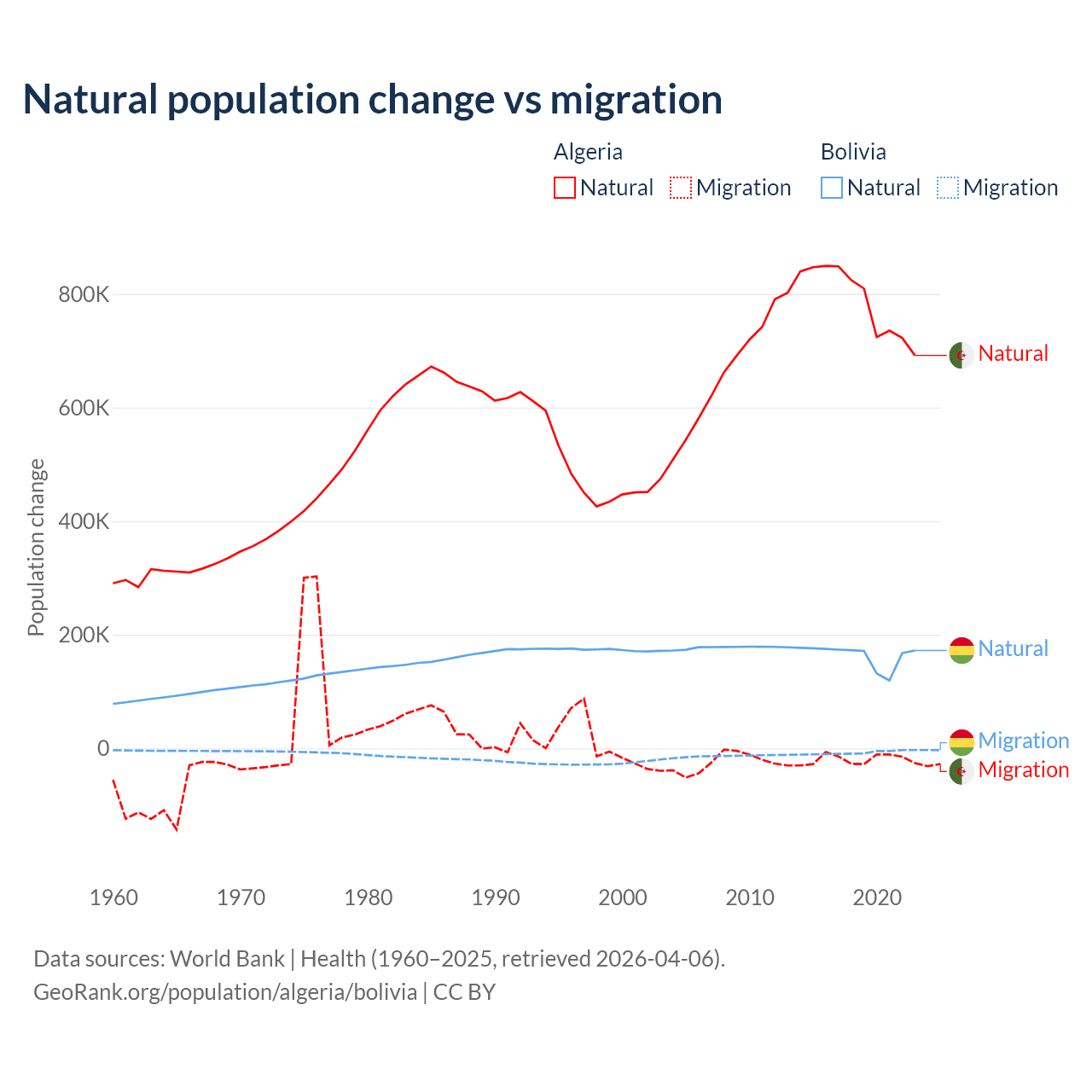 Over the last 10 years, 97.6% of the population change in Algeria is from natural causes (a gain of 7,892,580 people) and 2.42% is from migration (a loss of 195,723 people). In Bolivia 95.6% is from natural causes (a gain of 1,637,833 people) and 4.37% is from migration (a loss of 74,903 people).