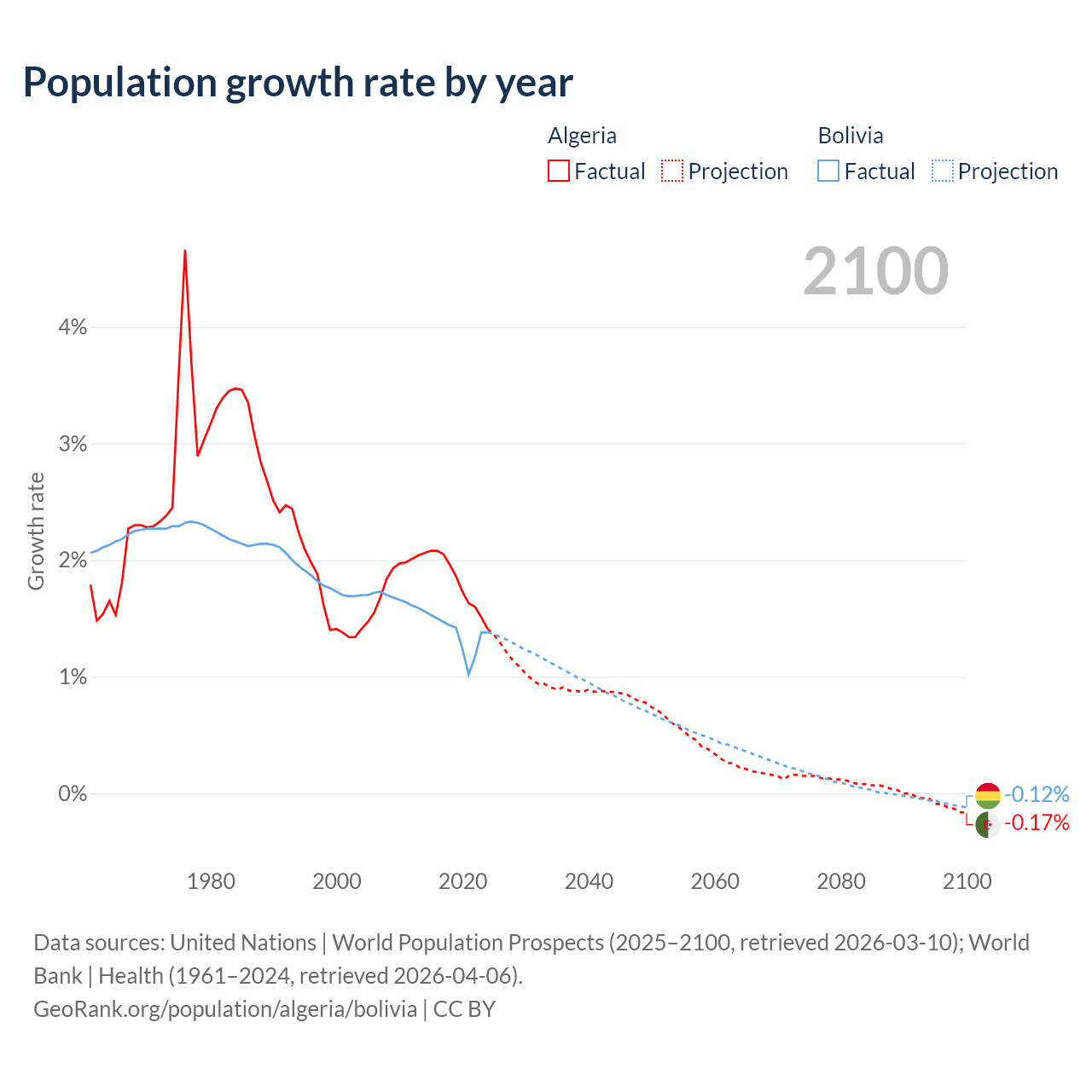 - For the last 10 years, Algeria has had an average growth rate of +1.81% per year vs +1.37% in Bolivia.