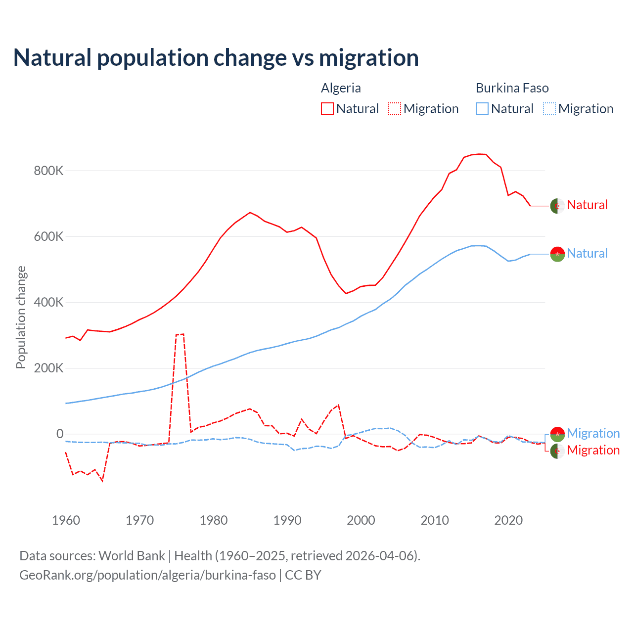 Over the last 10 years, 97.6% of the population change in Algeria is from natural causes (a gain of 7,892,580 people) and 2.42% is from migration (a loss of 195,723 people). In Burkina Faso 96.9% is from natural causes (a gain of 5,506,960 people) and 3.13% is from migration (a loss of 177,923 people).
