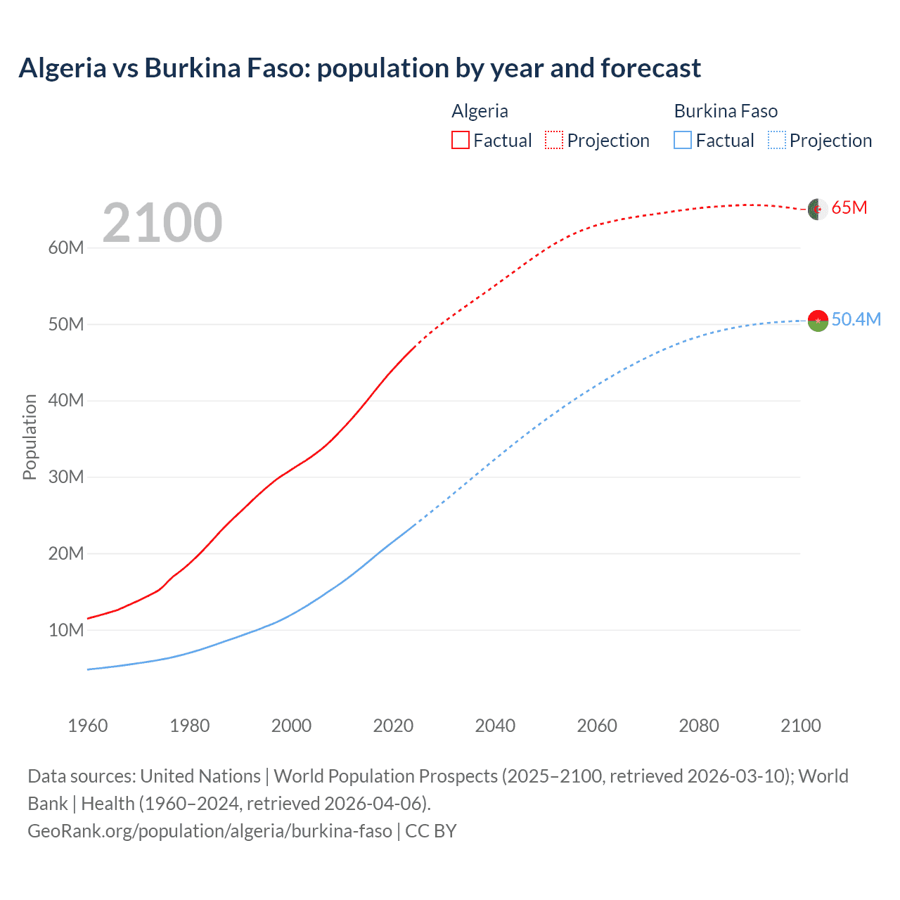 The latest officially reported population of Algeria was 46,814,308 in 2024 vs 23,548,781 people in Burkina Faso in 2024. In 2026, based on the adjusted UN estimation, the current Algeria's population is 48,222,325 people compared to 24,756,783 in Burkina Faso.