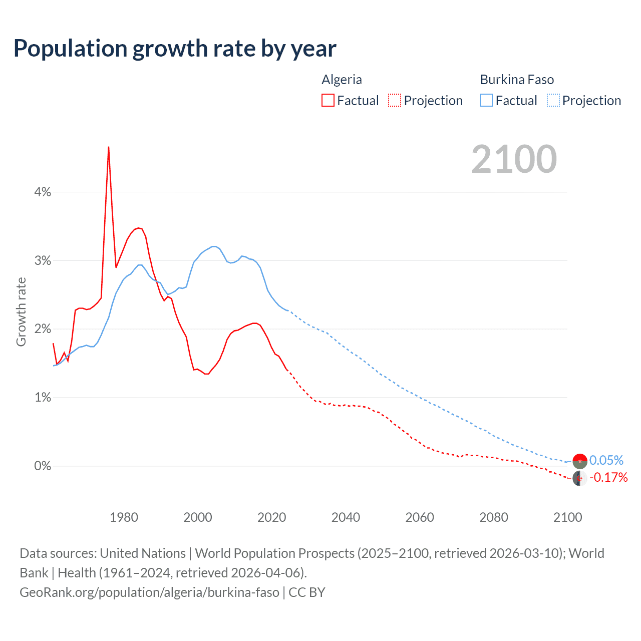 - For the last 10 years, Algeria has had an average growth rate of +1.81% per year vs +2.63% in Burkina Faso.