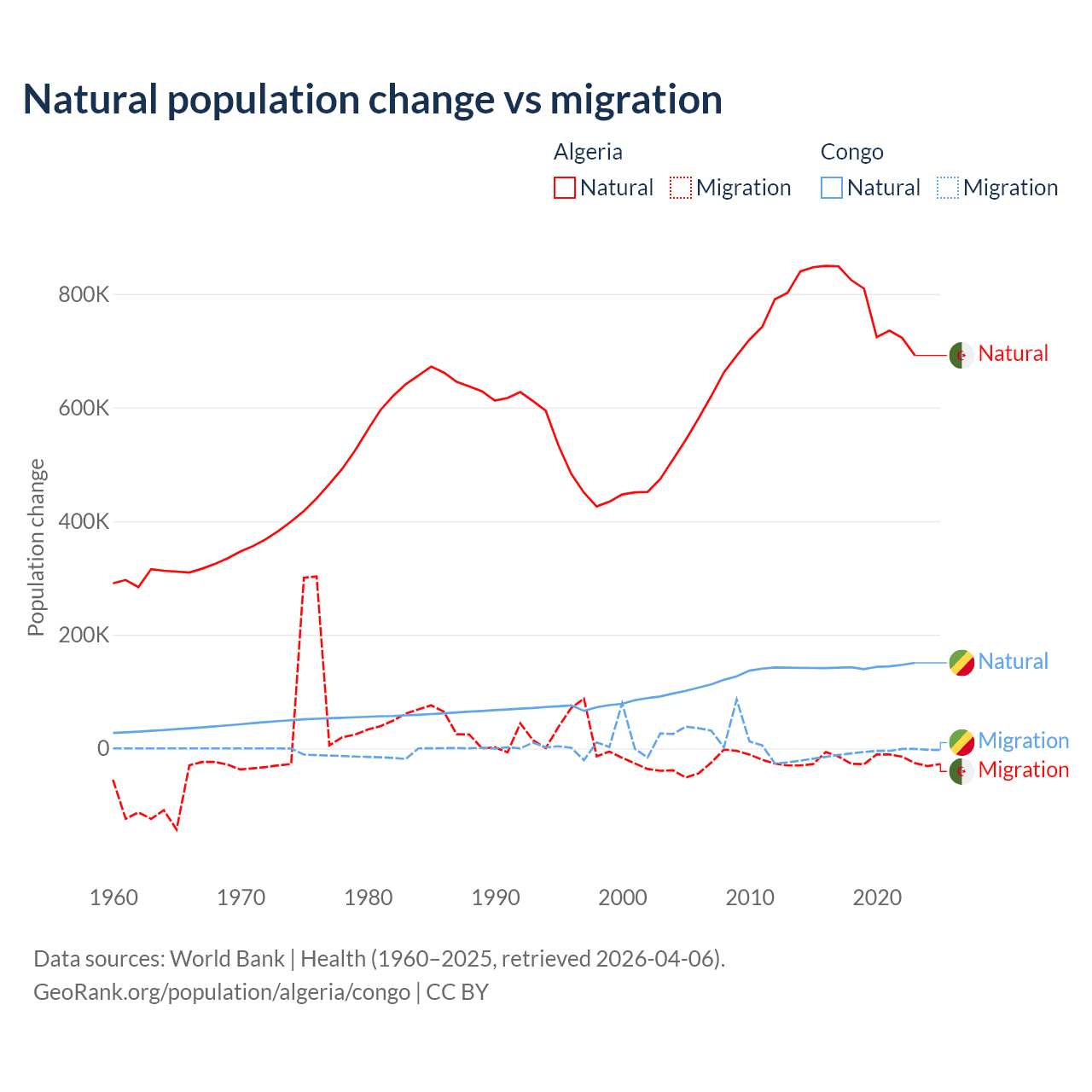 Over the last 10 years, 97.6% of the population change in Algeria is from natural causes (a gain of 7,892,580 people) and 2.42% is from migration (a loss of 195,723 people). In the Congo 94% is from natural causes (a gain of 1,434,056 people) and 6.04% is from migration (a loss of 92,251 people).