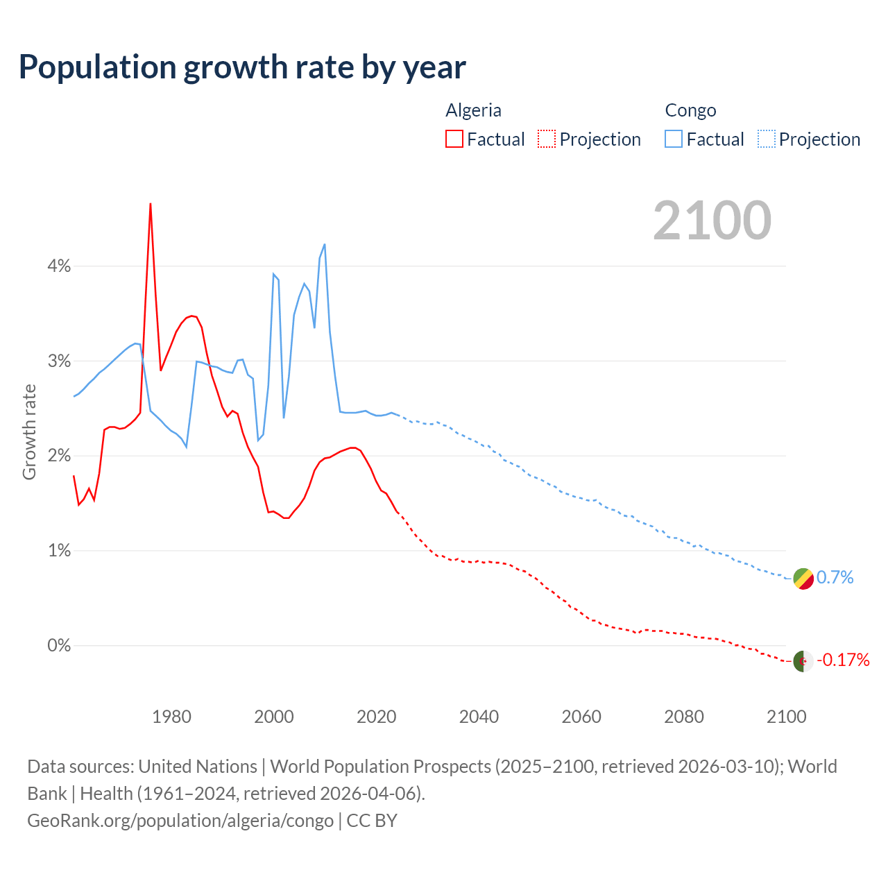 - For the last 10 years, Algeria has had an average growth rate of +1.81% per year vs +2.44% in the Congo.