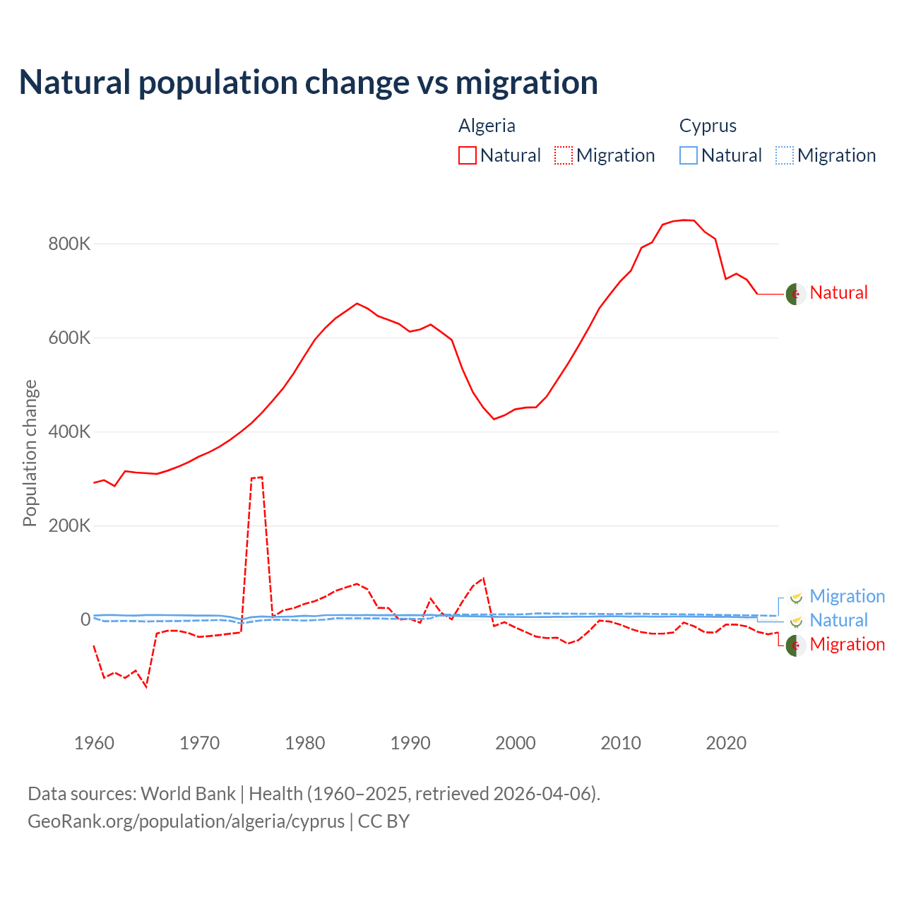 Over the last 10 years, 97.6% of the population change in Algeria is from natural causes (a gain of 7,892,580 people) and 2.42% is from migration (a loss of 195,723 people). In Cyprus 36.2% is from natural causes (a gain of 57,464 people) and 63.8% is from migration (a gain of 101,458 people).