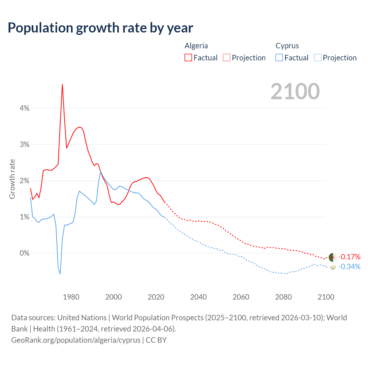 - For the last 10 years, Algeria has had an average growth rate of +1.81% per year vs +1.26% in Cyprus.