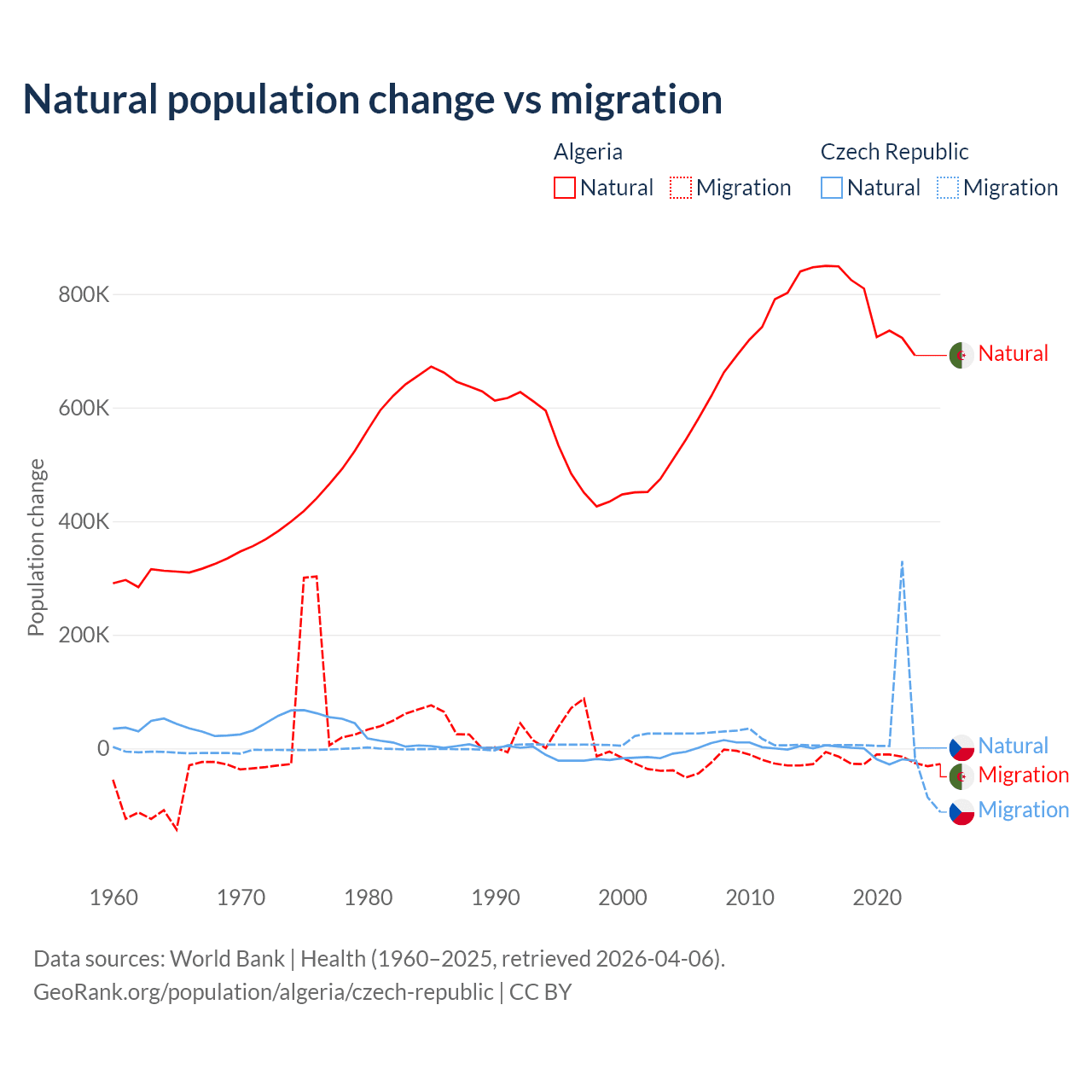 Over the last 10 years, 97.6% of the population change in Algeria is from natural causes (a gain of 7,892,580 people) and 2.42% is from migration (a loss of 195,723 people). In the Czech Republic 17.3% is from natural causes (a loss of 74,826 people) and 82.7% is from migration (a gain of 357,502 people).