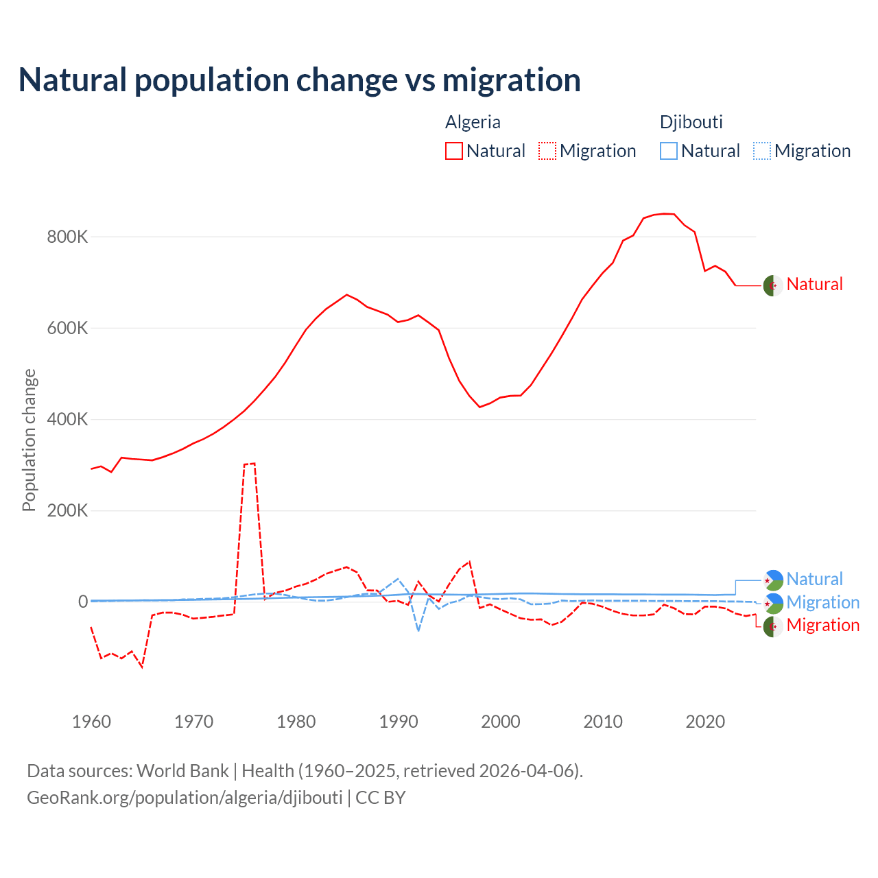 Over the last 10 years, 97.6% of the population change in Algeria is from natural causes (a gain of 7,892,580 people) and 2.42% is from migration (a loss of 195,723 people). In Djibouti 92.1% is from natural causes (a gain of 153,892 people) and 7.87% is from migration (a gain of 13,138 people).