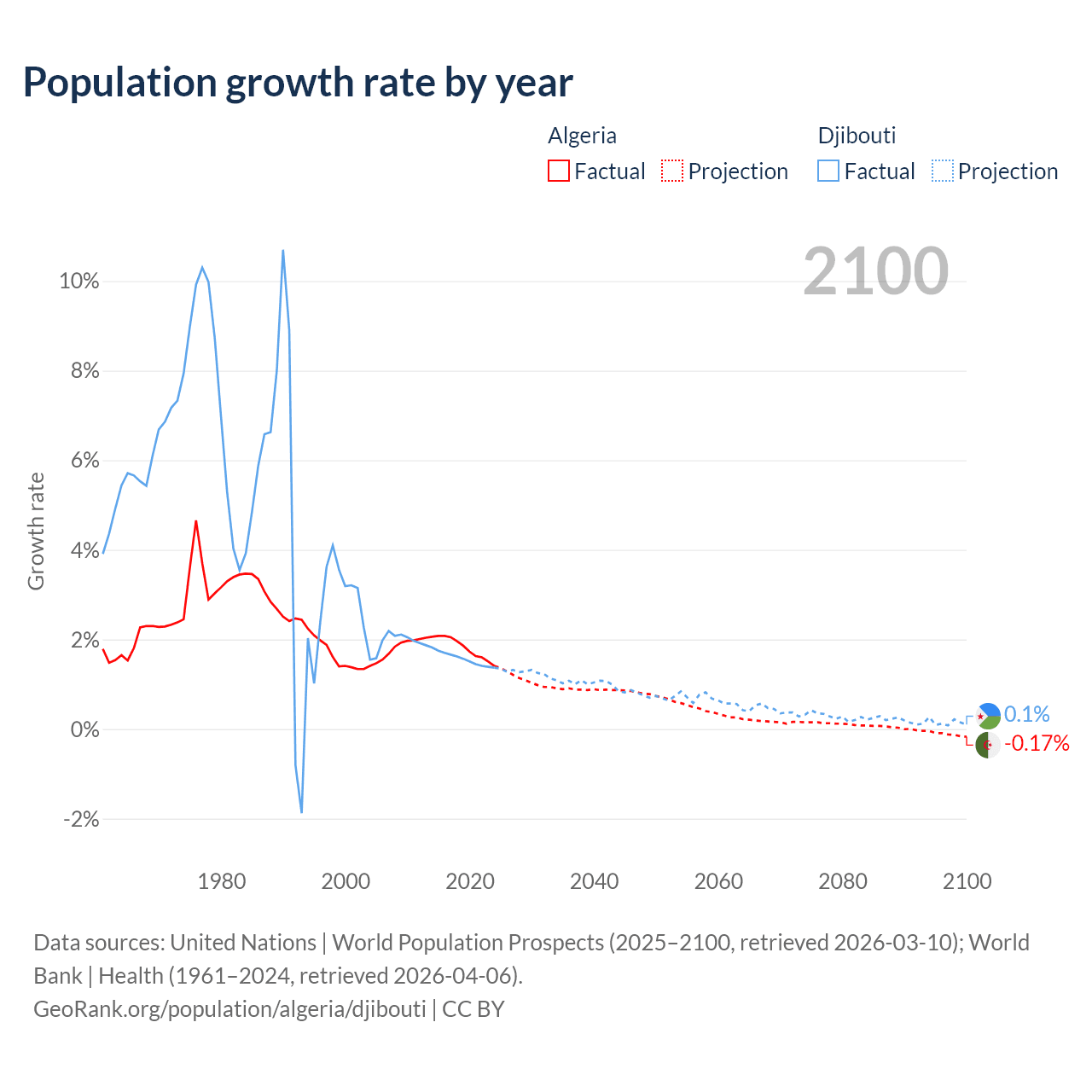 - For the last 10 years, Algeria has had an average growth rate of +1.81% per year vs +1.57% in Djibouti.
