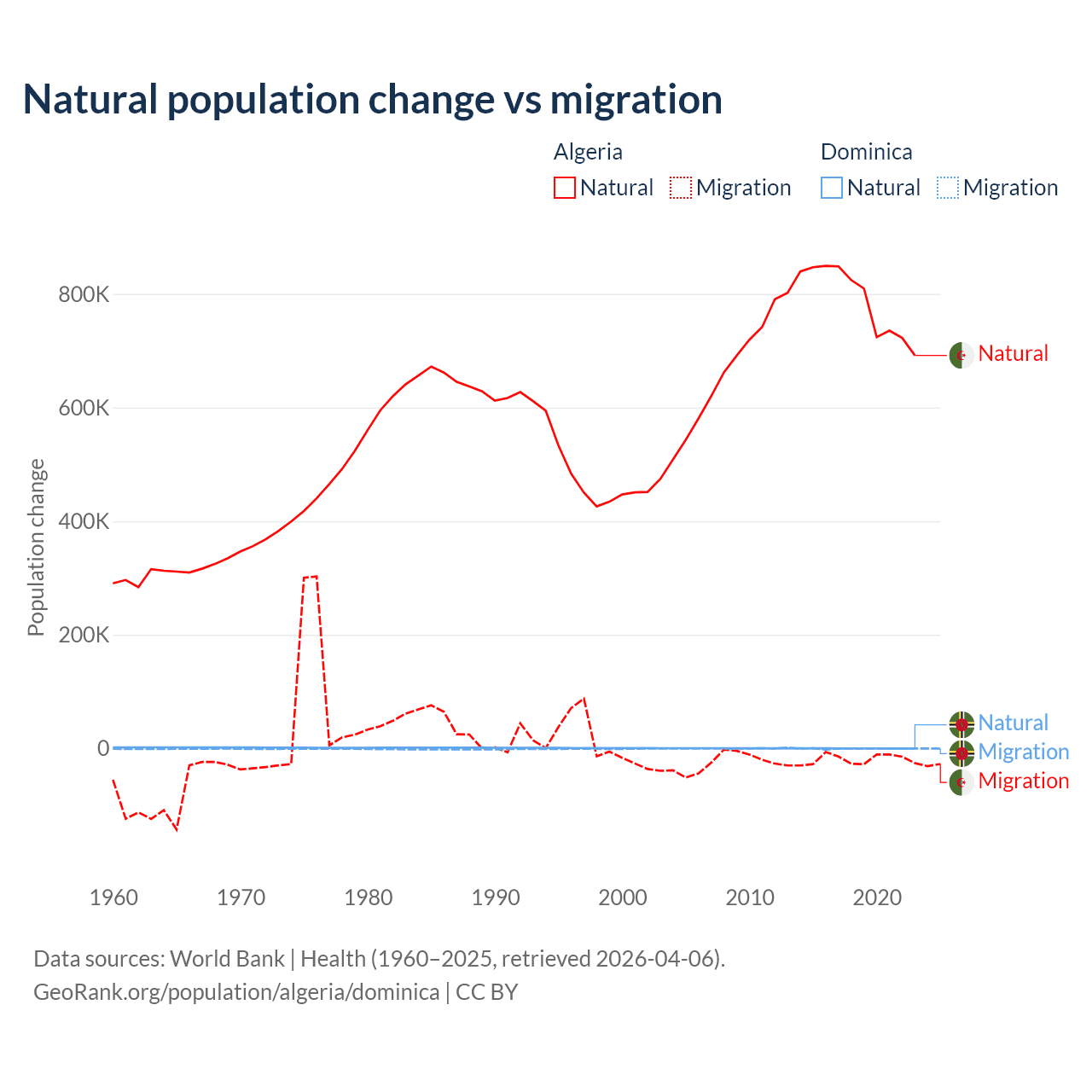 Over the last 10 years, 97.6% of the population change in Algeria is from natural causes (a gain of 7,892,580 people) and 2.42% is from migration (a loss of 195,723 people). In Dominica 4.63% is from natural causes (a loss of 190 people) and 95.4% is from migration (a loss of 3,914 people).