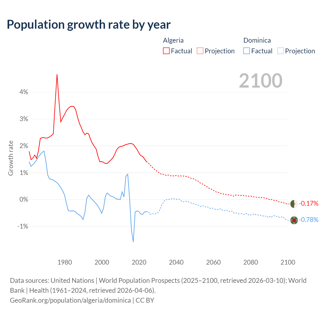 - For the last 10 years, Algeria has had an average growth rate of +1.81% per year vs -0.47% in Dominica.