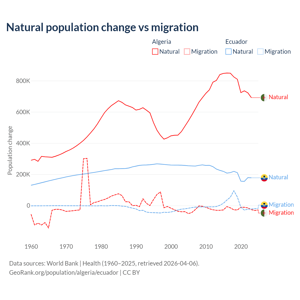 Over the last 10 years, 97.6% of the population change in Algeria is from natural causes (a gain of 7,892,580 people) and 2.42% is from migration (a loss of 195,723 people). In Ecuador 91.9% is from natural causes (a gain of 1,964,352 people) and 8.08% is from migration (a gain of 172,707 people).