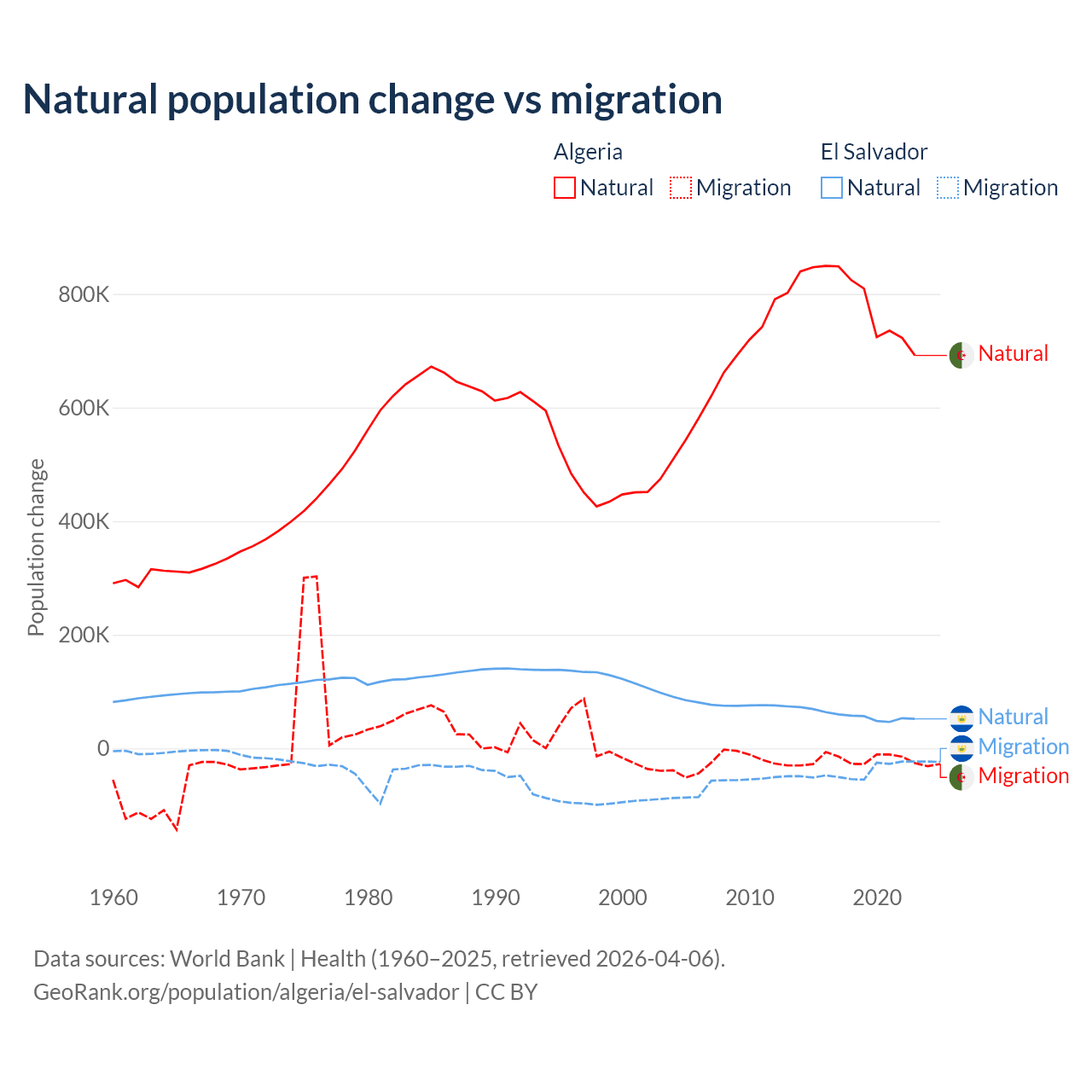 Over the last 10 years, 97.6% of the population change in Algeria is from natural causes (a gain of 7,892,580 people) and 2.42% is from migration (a loss of 195,723 people). In El Salvador 58.8% is from natural causes (a gain of 579,641 people) and 41.2% is from migration (a loss of 406,874 people).