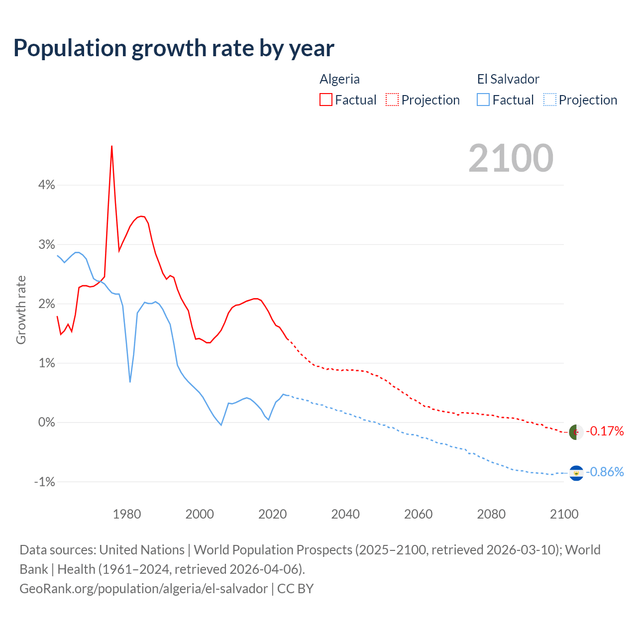 - For the last 10 years, Algeria has had an average growth rate of +1.81% per year vs +0.29% in El Salvador.