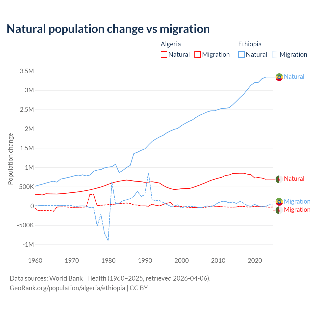 Over the last 10 years, 97.6% of the population change in Algeria is from natural causes (a gain of 7,892,580 people) and 2.42% is from migration (a loss of 195,723 people). In Ethiopia 98.8% is from natural causes (a gain of 30,237,373 people) and 1.19% is from migration (a gain of 365,488 people).
