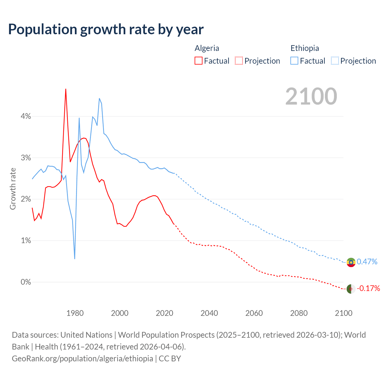 - For the last 10 years, Algeria has had an average growth rate of +1.81% per year vs +2.71% in Ethiopia.