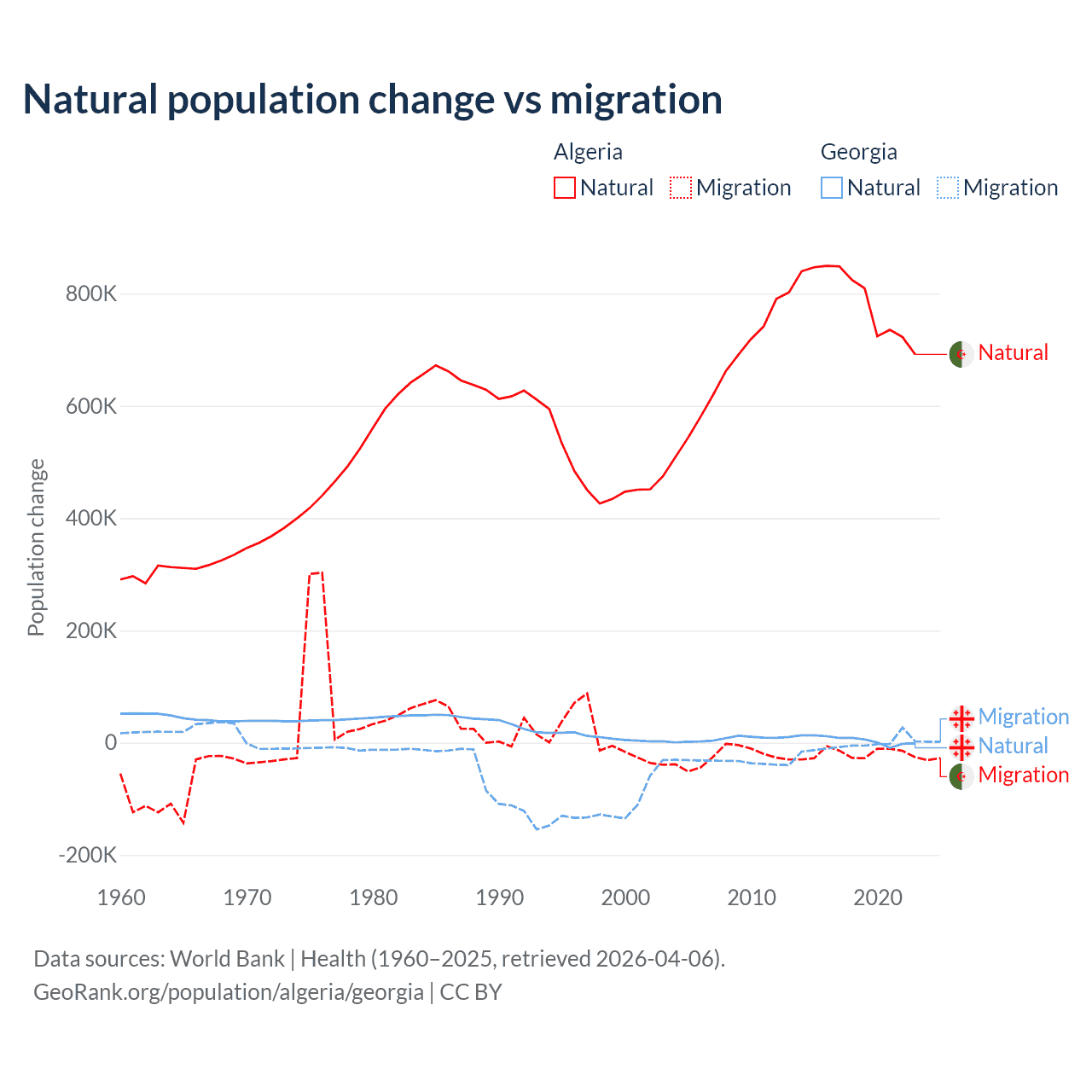 Over the last 10 years, 97.6% of the population change in Algeria is from natural causes (a gain of 7,892,580 people) and 2.42% is from migration (a loss of 195,723 people). In Georgia 57.7% is from natural causes (a gain of 47,646 people) and 42.3% is from migration (a loss of 34,907 people).