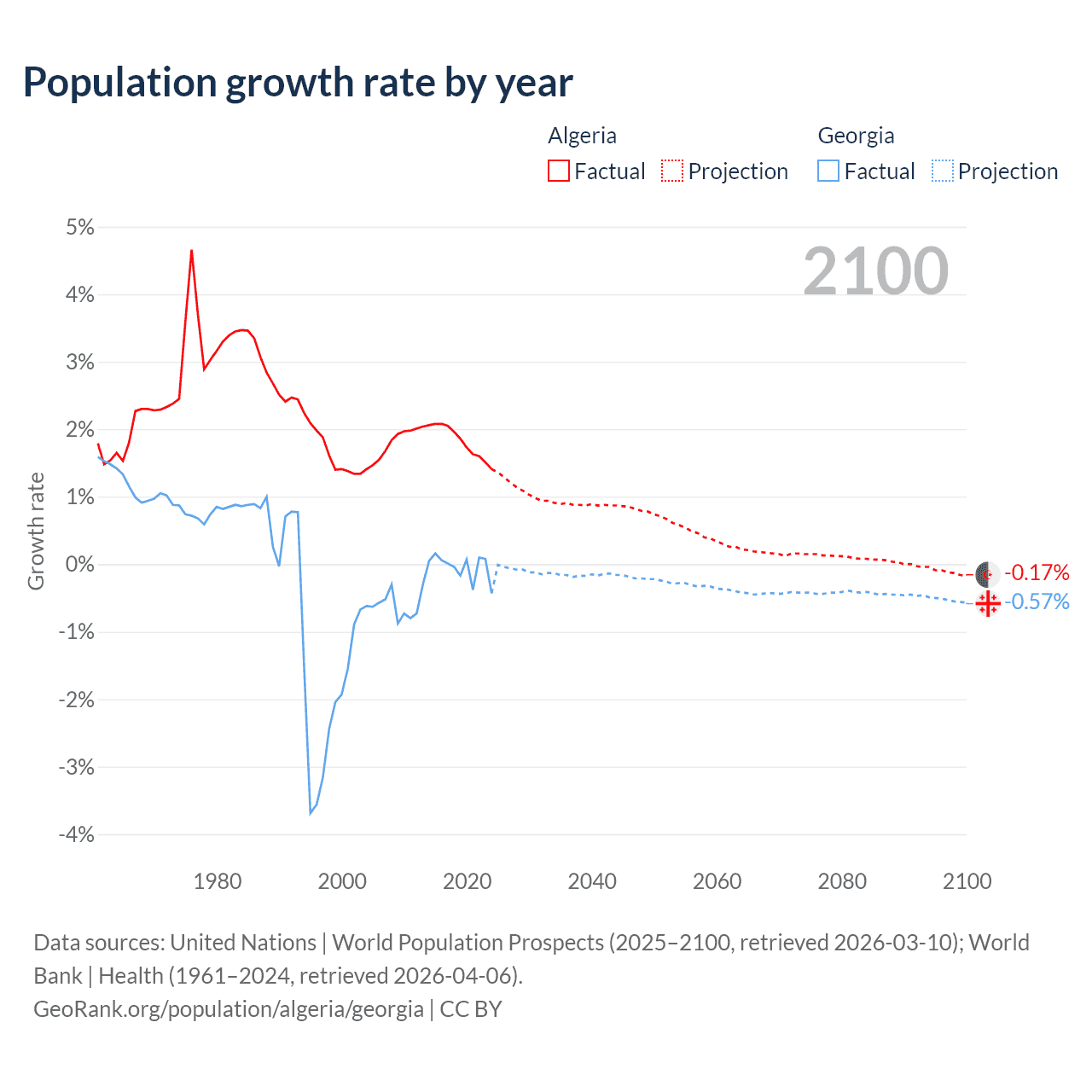 - For the last 10 years, Algeria has had an average growth rate of +1.81% per year vs -0.04% in Georgia.