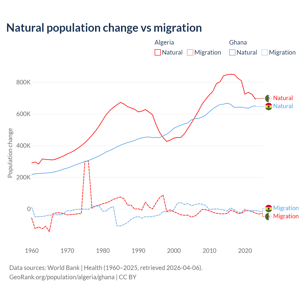 Over the last 10 years, 97.6% of the population change in Algeria is from natural causes (a gain of 7,892,580 people) and 2.42% is from migration (a loss of 195,723 people). In Ghana 98.6% is from natural causes (a gain of 6,484,449 people) and 1.37% is from migration (a loss of 90,310 people).