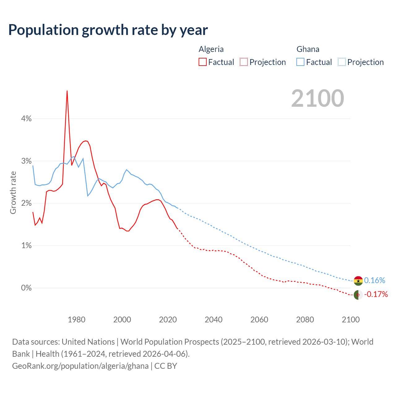 - For the last 10 years, Algeria has had an average growth rate of +1.81% per year vs +2.1% in Ghana.