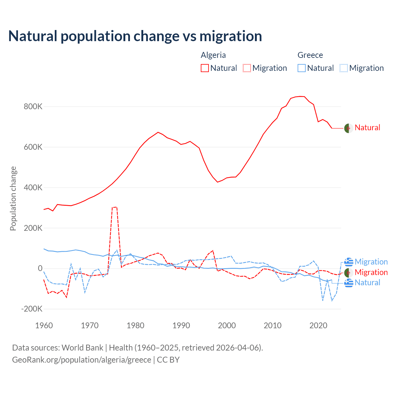 Over the last 10 years, 97.6% of the population change in Algeria is from natural causes (a gain of 7,892,580 people) and 2.42% is from migration (a loss of 195,723 people). In Greece 51.9% is from natural causes (a loss of 411,426 people) and 48.1% is from migration (a loss of 381,824 people).
