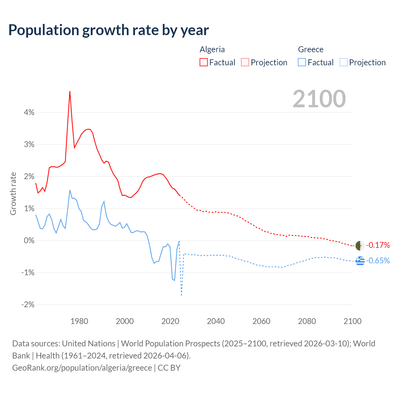 - For the last 10 years, Algeria has had an average growth rate of +1.81% per year vs -0.47% in Greece.