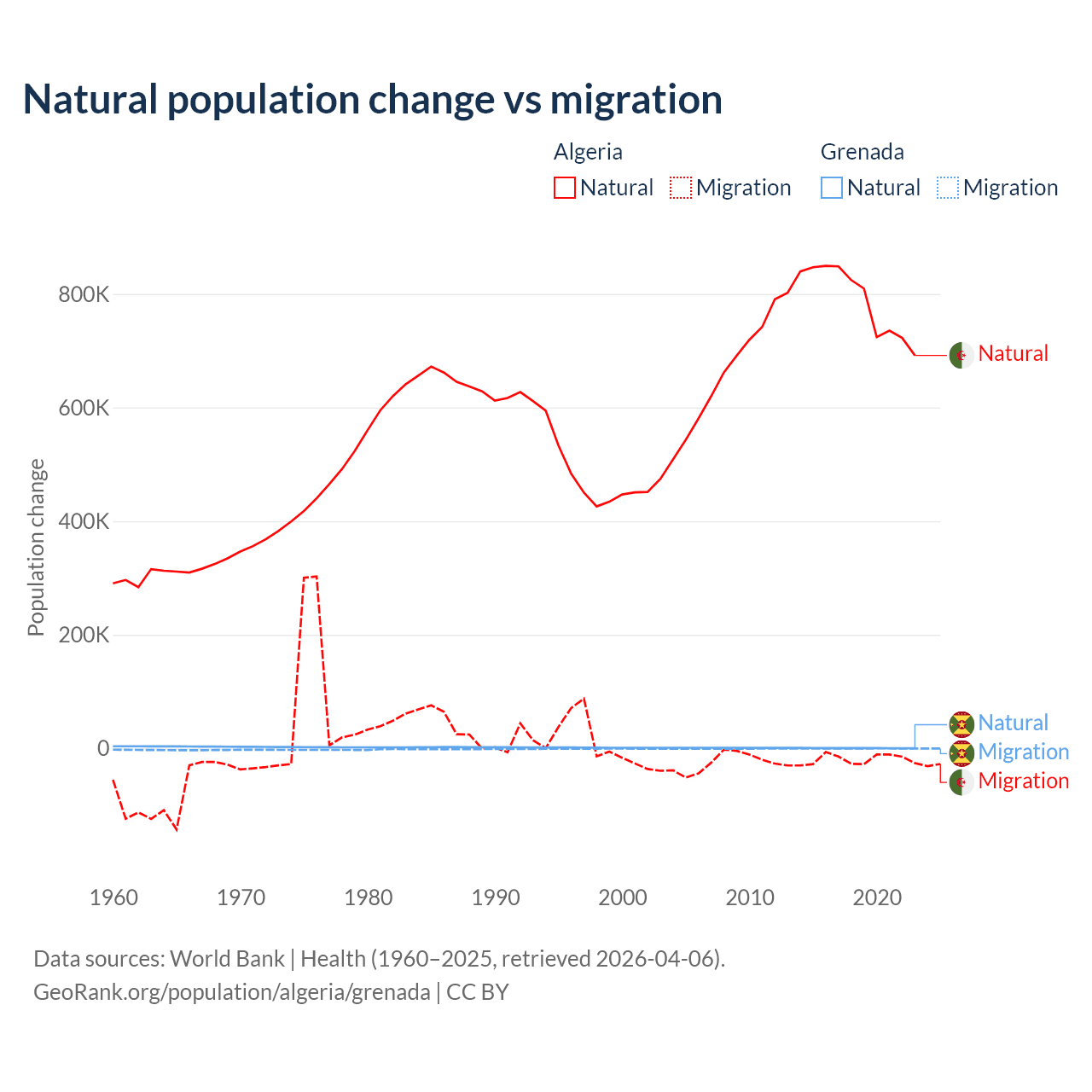 Over the last 10 years, 97.6% of the population change in Algeria is from natural causes (a gain of 7,892,580 people) and 2.42% is from migration (a loss of 195,723 people). In Grenada 76% is from natural causes (a gain of 4,850 people) and 24% is from migration (a loss of 1,535 people).