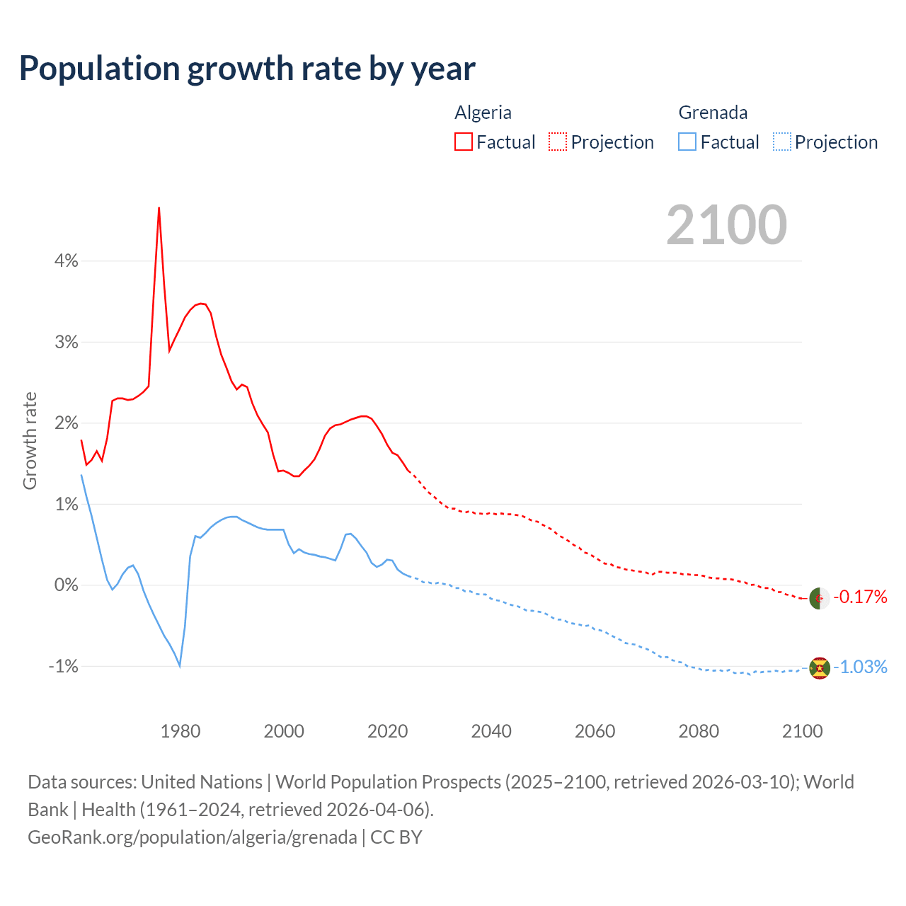 - For the last 10 years, Algeria has had an average growth rate of +1.81% per year vs +0.29% in Grenada.