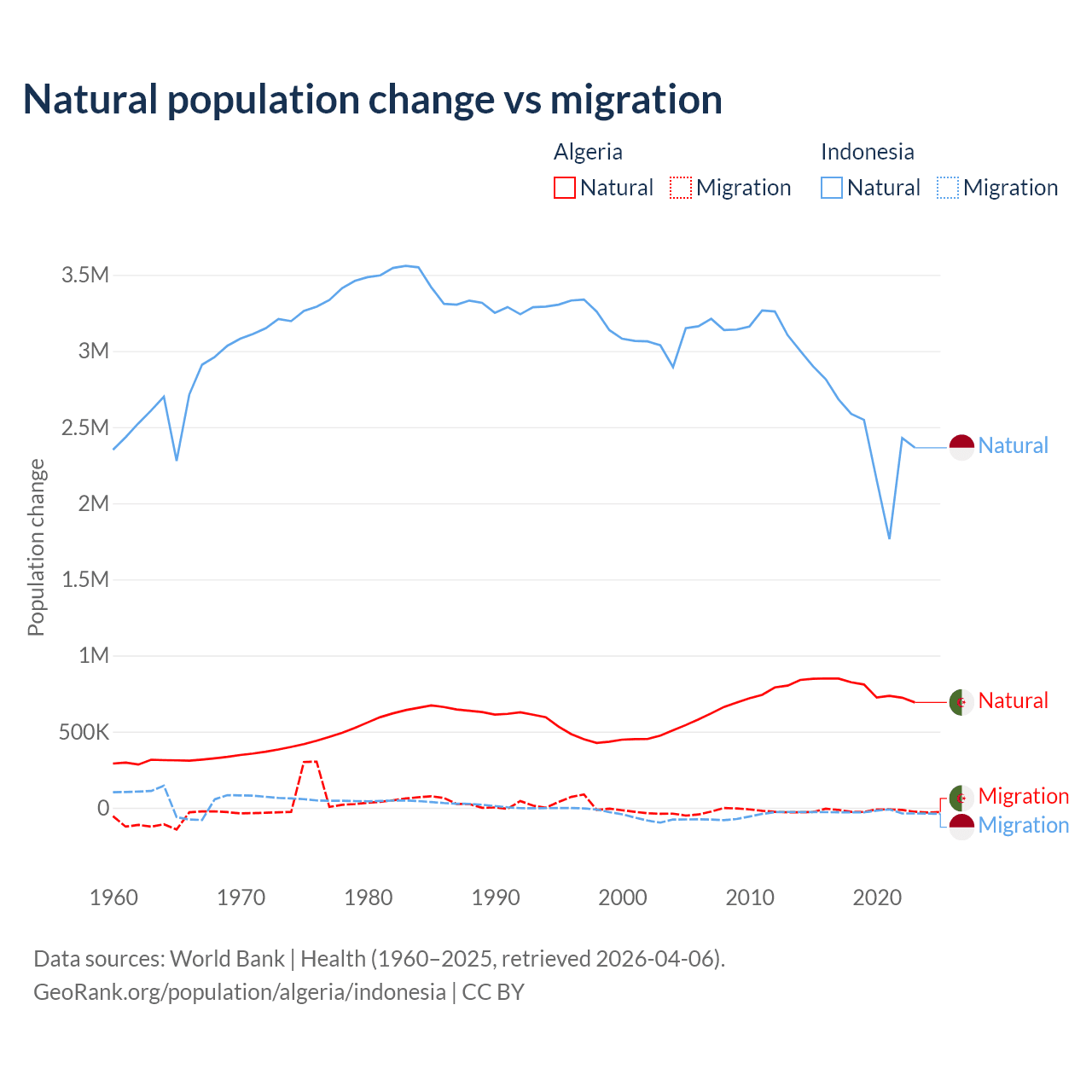 Over the last 10 years, 97.6% of the population change in Algeria is from natural causes (a gain of 7,892,580 people) and 2.42% is from migration (a loss of 195,723 people). In Indonesia 98.9% is from natural causes (a gain of 25,242,860 people) and 1.1% is from migration (a loss of 280,258 people).