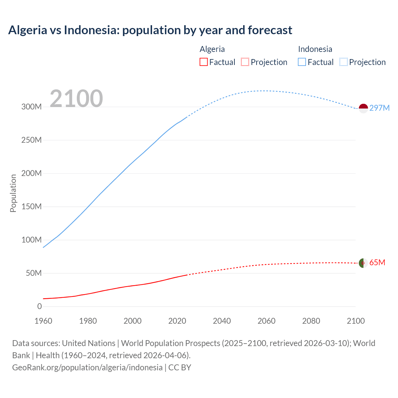The latest officially reported population of Algeria was 46,814,308 in 2024 vs 283,487,931 people in Indonesia in 2024. In 2026, based on the adjusted UN estimation, the current Algeria's population is 48,222,325 people compared to 288,551,776 in Indonesia.