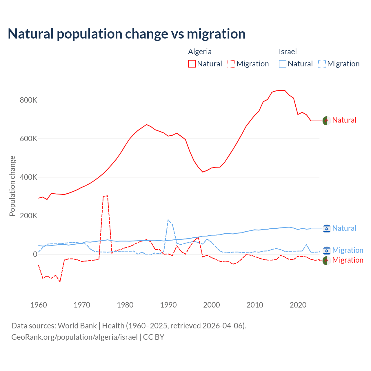 Over the last 10 years, 97.6% of the population change in Algeria is from natural causes (a gain of 7,892,580 people) and 2.42% is from migration (a loss of 195,723 people). In Israel 86% is from natural causes (a gain of 1,343,492 people) and 14% is from migration (a gain of 219,048 people).