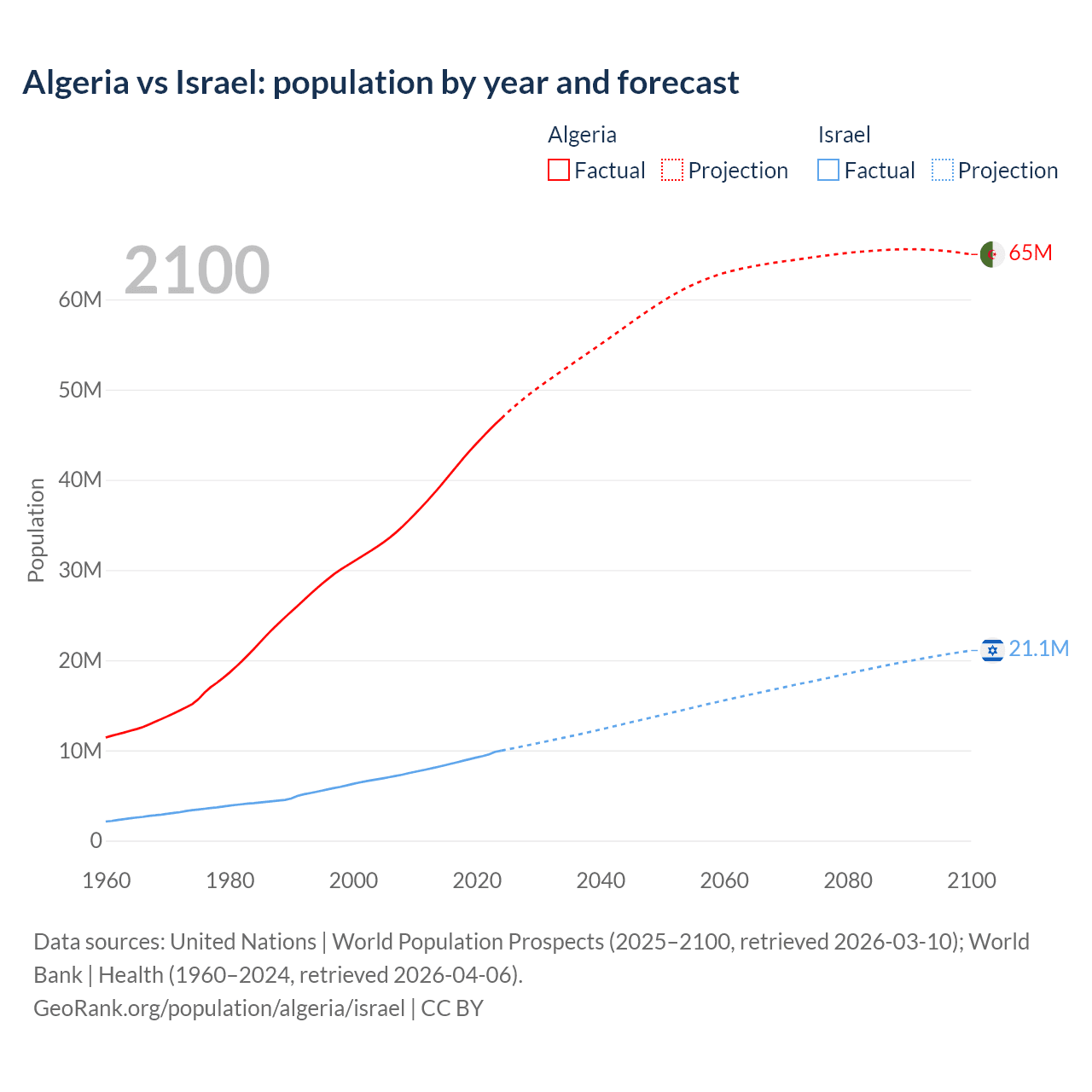 The latest officially reported population of Algeria was 46,814,308 in 2024 vs 9,974,400 people in Israel in 2024. In 2026, based on the adjusted UN estimation, the current Algeria's population is 48,222,325 people compared to 10,290,887 in Israel.