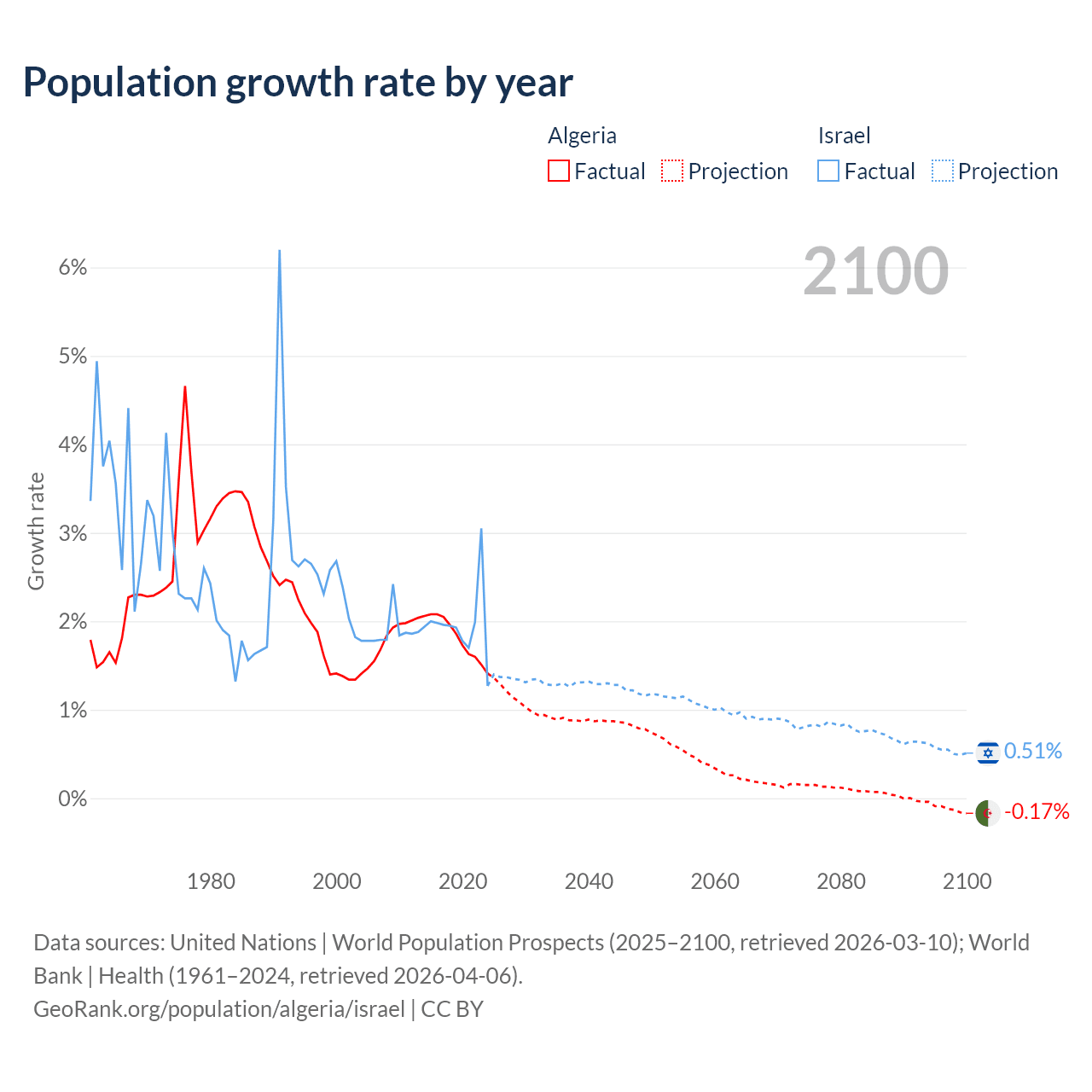 - For the last 10 years, Algeria has had an average growth rate of +1.81% per year vs +1.96% in Israel.