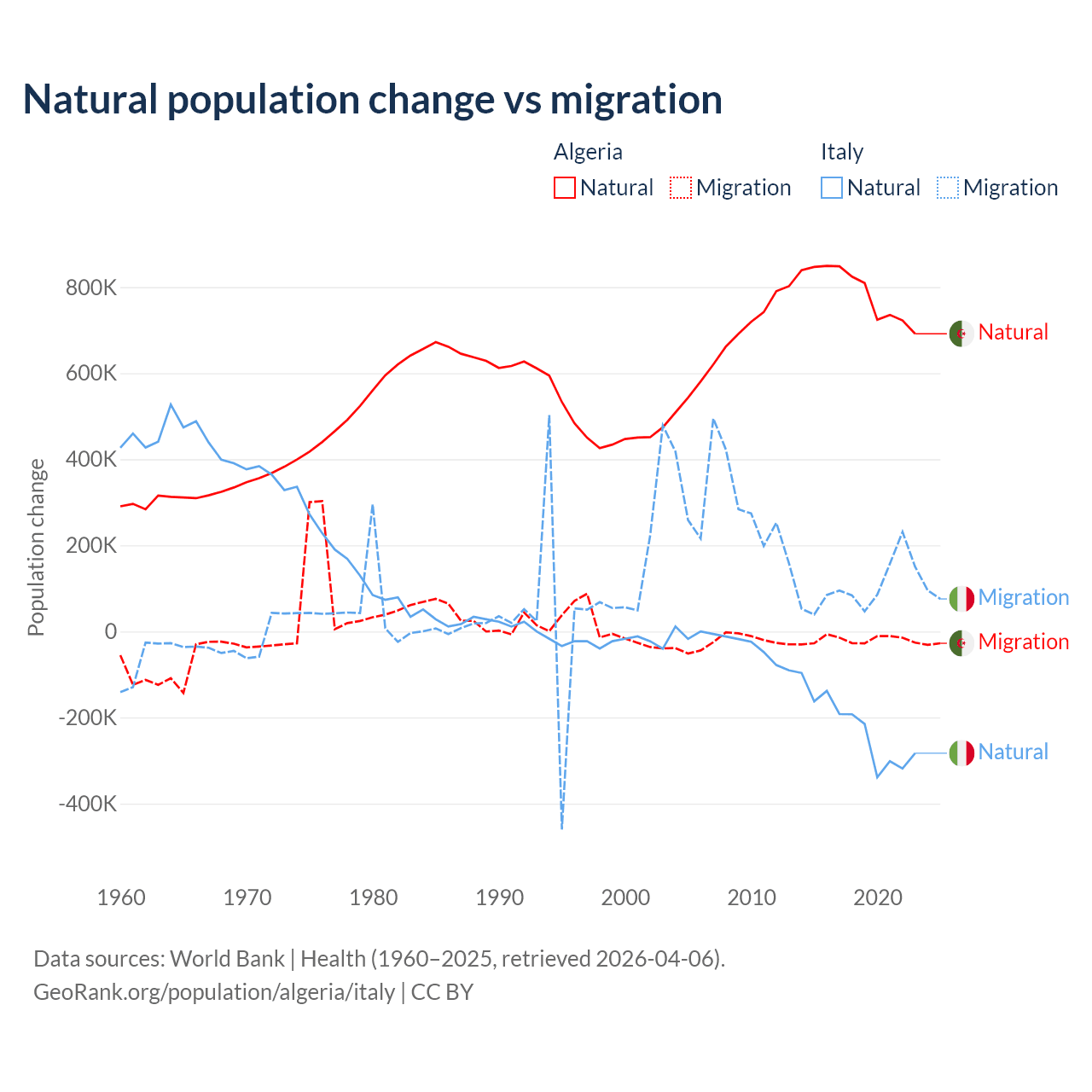 Over the last 10 years, 97.6% of the population change in Algeria is from natural causes (a gain of 7,892,580 people) and 2.42% is from migration (a loss of 195,723 people). In Italy 68.6% is from natural causes (a loss of 2,239,084 people) and 31.4% is from migration (a gain of 1,026,128 people).