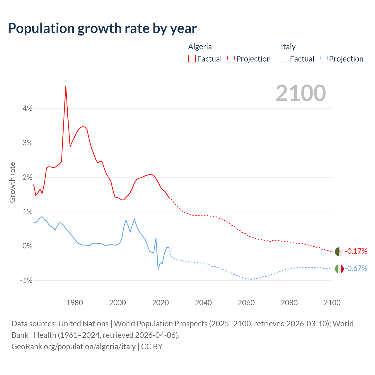 - For the last 10 years, Algeria has had an average growth rate of +1.81% per year vs -0.21% in Italy.