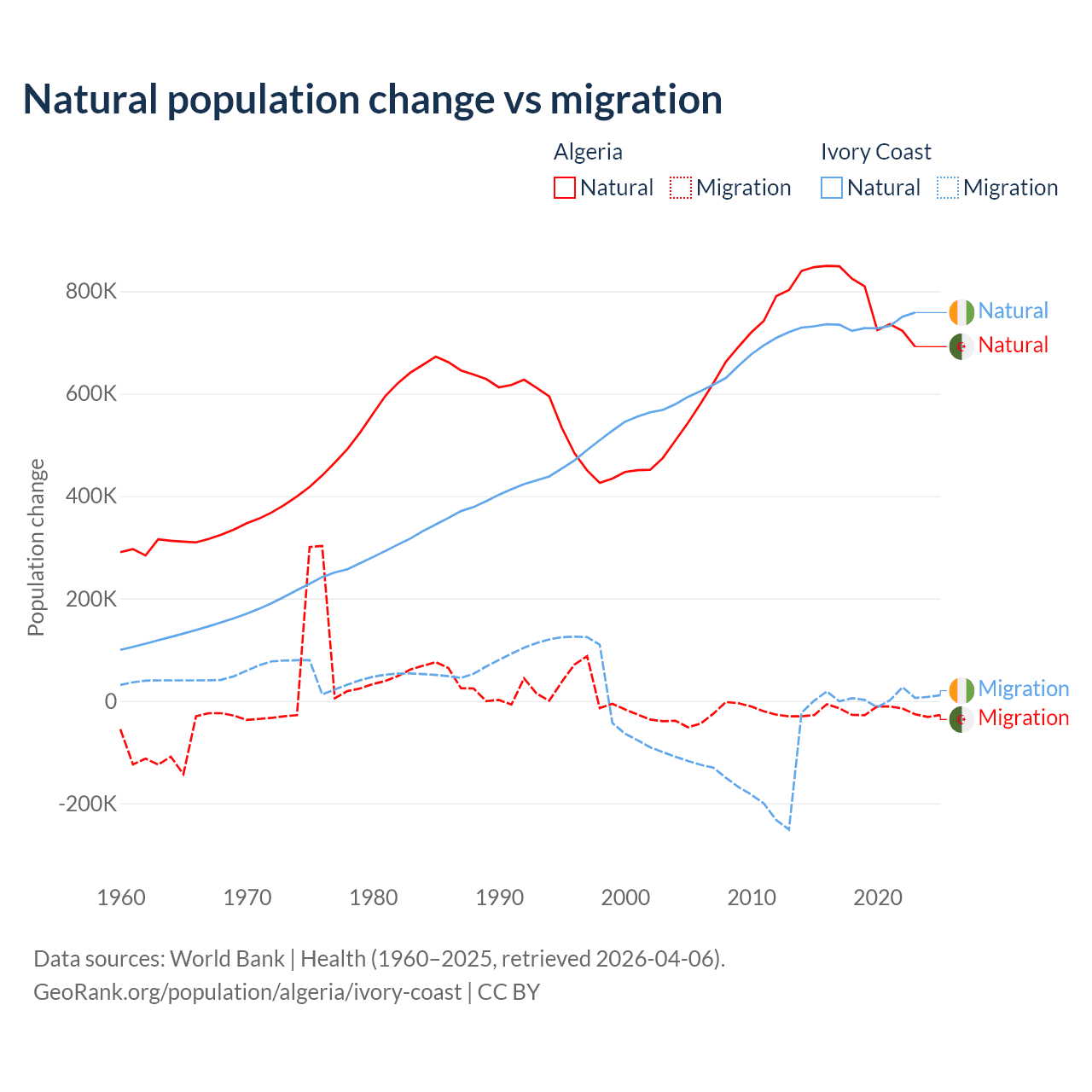 Over the last 10 years, 97.6% of the population change in Algeria is from natural causes (a gain of 7,892,580 people) and 2.42% is from migration (a loss of 195,723 people). In Ivory Coast 99.7% is from natural causes (a gain of 7,348,944 people) and 0.33% is from migration (a gain of 24,432 people).