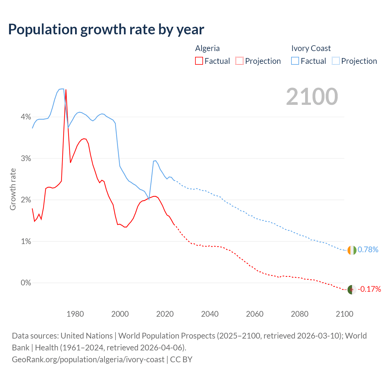 - For the last 10 years, Algeria has had an average growth rate of +1.81% per year vs +2.65% in Ivory Coast.