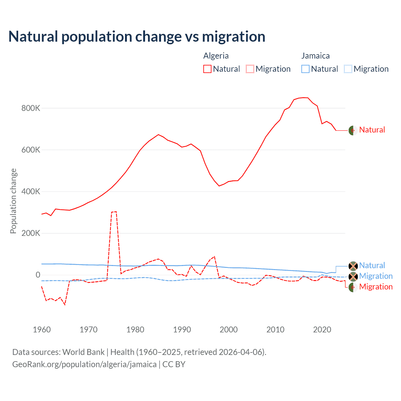 Over the last 10 years, 97.6% of the population change in Algeria is from natural causes (a gain of 7,892,580 people) and 2.42% is from migration (a loss of 195,723 people). In Jamaica 61.3% is from natural causes (a gain of 137,465 people) and 38.7% is from migration (a loss of 86,681 people).