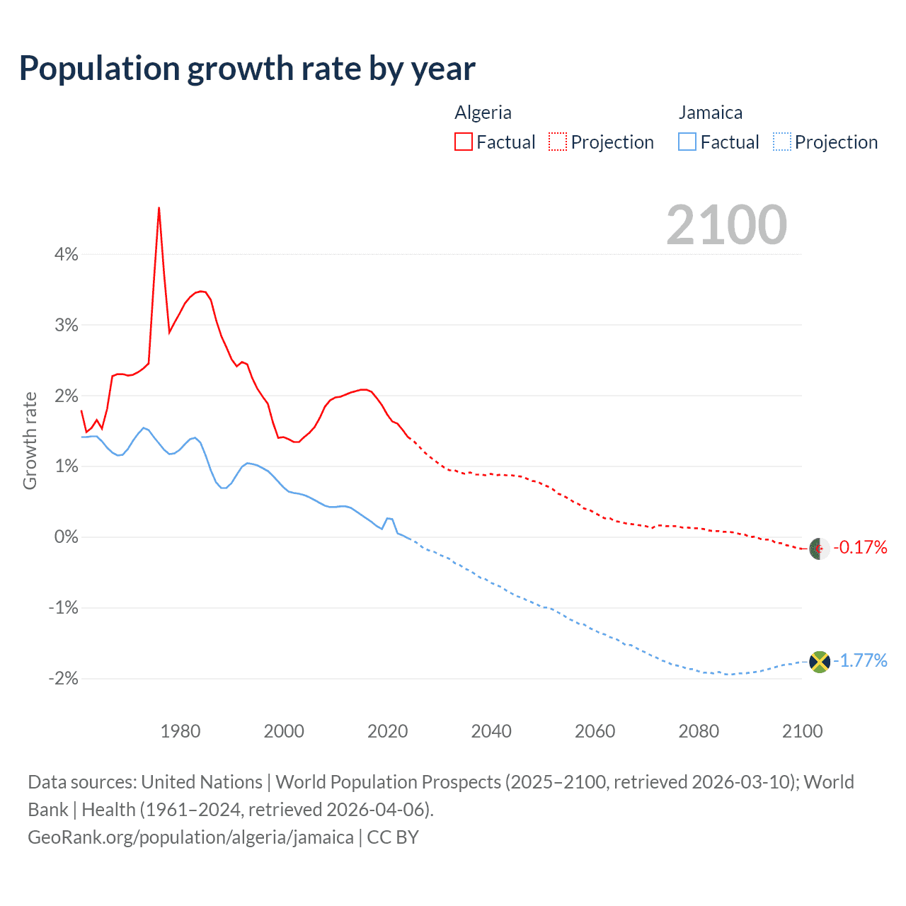 - For the last 10 years, Algeria has had an average growth rate of +1.81% per year vs +0.18% in Jamaica.