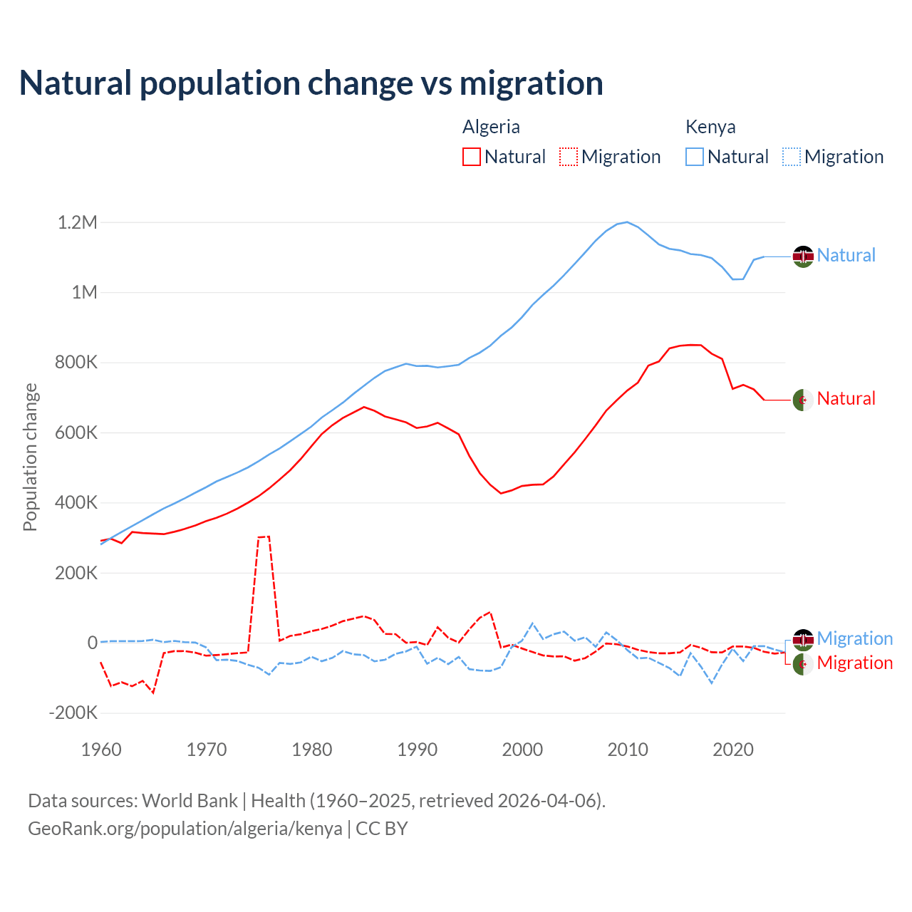 Over the last 10 years, 97.6% of the population change in Algeria is from natural causes (a gain of 7,892,580 people) and 2.42% is from migration (a loss of 195,723 people). In Kenya 95.3% is from natural causes (a gain of 10,892,362 people) and 4.67% is from migration (a loss of 533,876 people).