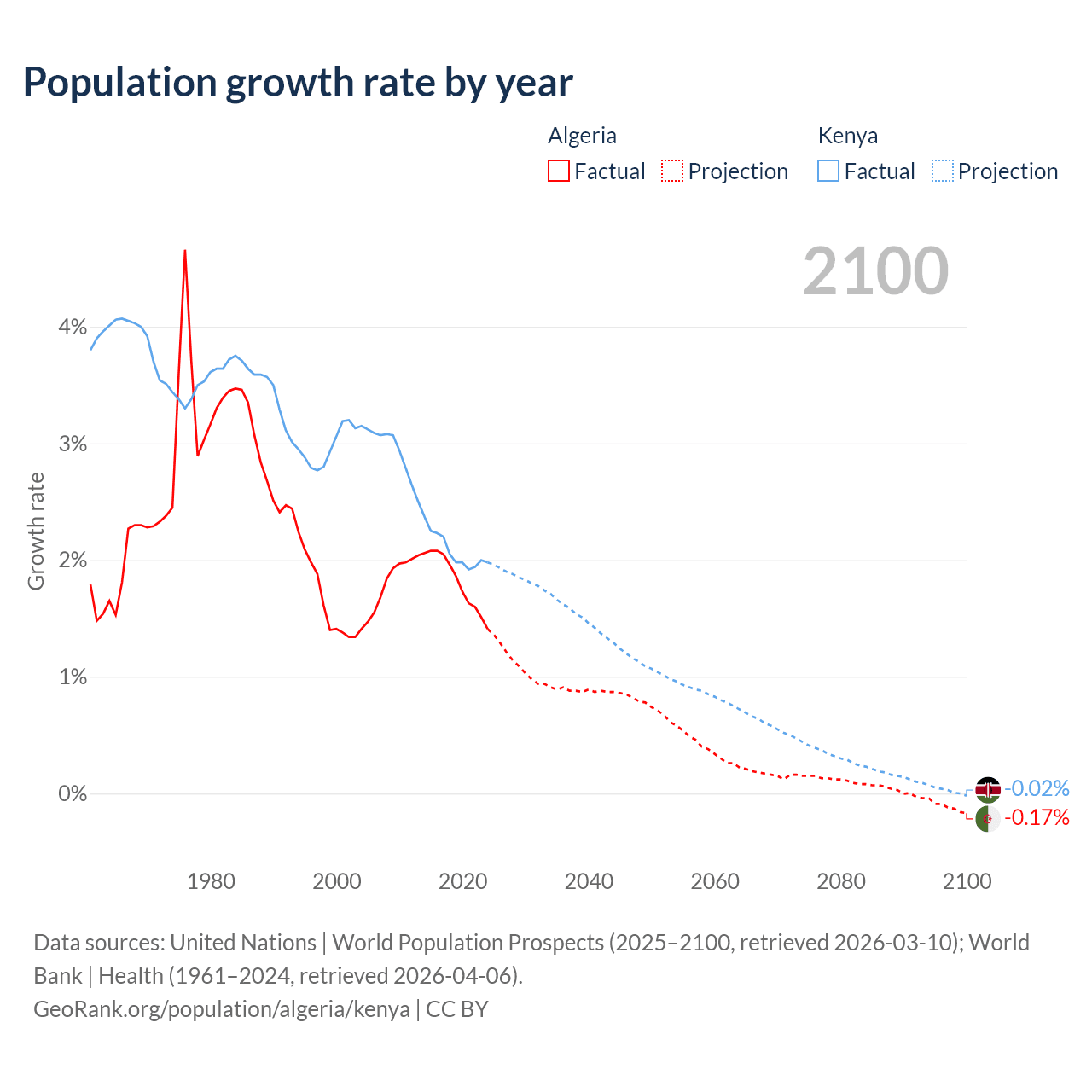 - For the last 10 years, Algeria has had an average growth rate of +1.81% per year vs +2.08% in Kenya.