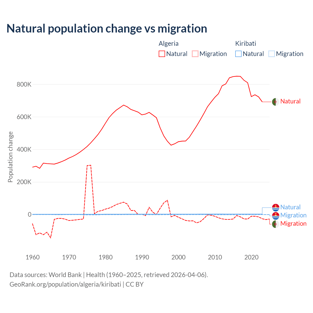 Over the last 10 years, 97.6% of the population change in Algeria is from natural causes (a gain of 7,892,580 people) and 2.42% is from migration (a loss of 195,723 people). In Kiribati 80% is from natural causes (a gain of 25,262 people) and 20% is from migration (a loss of 6,330 people).