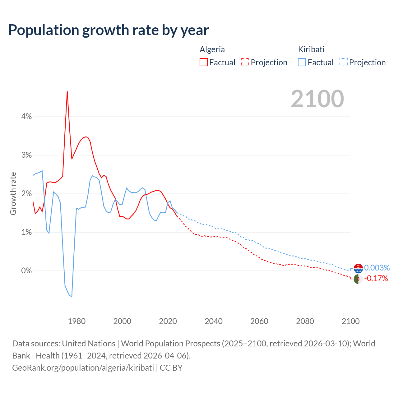 - For the last 10 years, Algeria has had an average growth rate of +1.81% per year vs +1.53% in Kiribati.