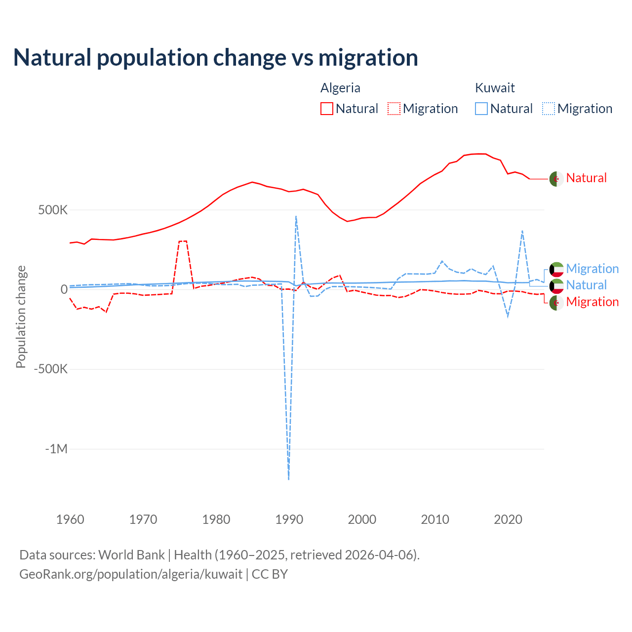 Over the last 10 years, 97.6% of the population change in Algeria is from natural causes (a gain of 7,892,580 people) and 2.42% is from migration (a loss of 195,723 people). In Kuwait 35.8% is from natural causes (a gain of 470,645 people) and 64.2% is from migration (a gain of 845,142 people).