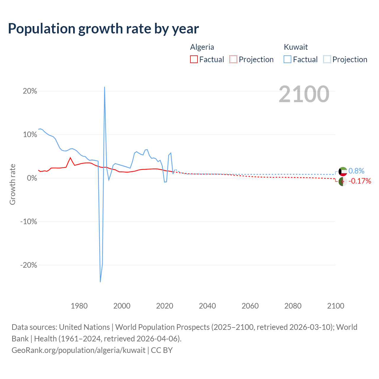 - For the last 10 years, Algeria has had an average growth rate of +1.81% per year vs +3.1% in Kuwait.