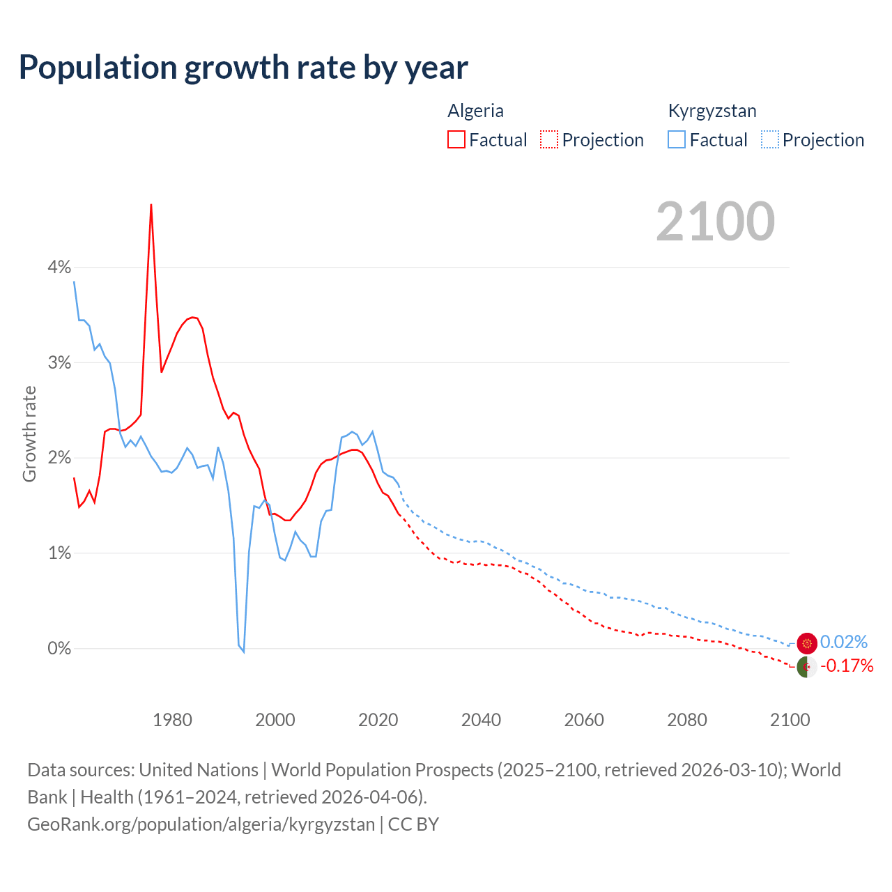 - For the last 10 years, Algeria has had an average growth rate of +1.81% per year vs +2.05% in Kyrgyzstan.