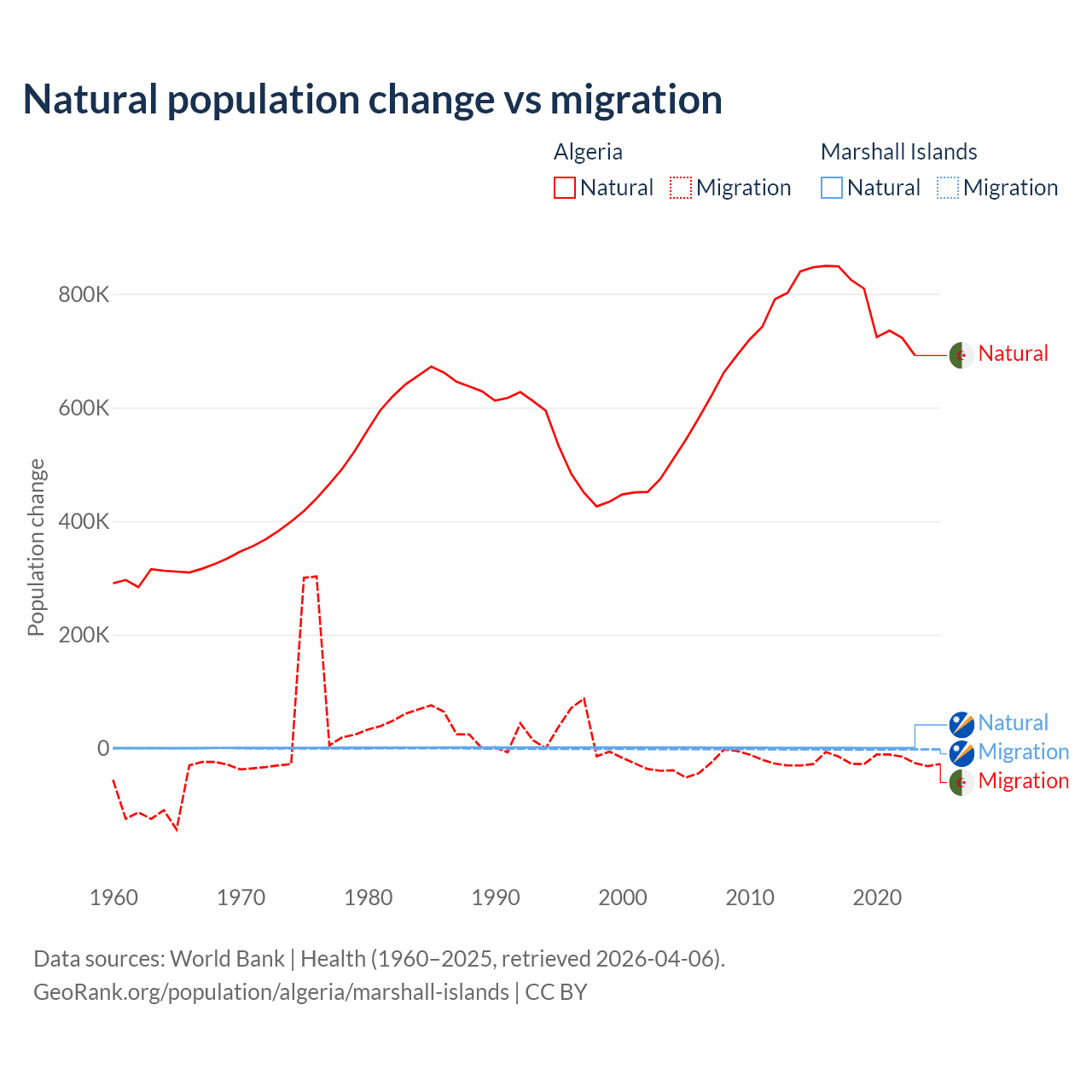 Over the last 10 years, 97.6% of the population change in Algeria is from natural causes (a gain of 7,892,580 people) and 2.42% is from migration (a loss of 195,723 people). In the Marshall Islands 27.8% is from natural causes (a gain of 7,592 people) and 72.2% is from migration (a loss of 19,682 people).
