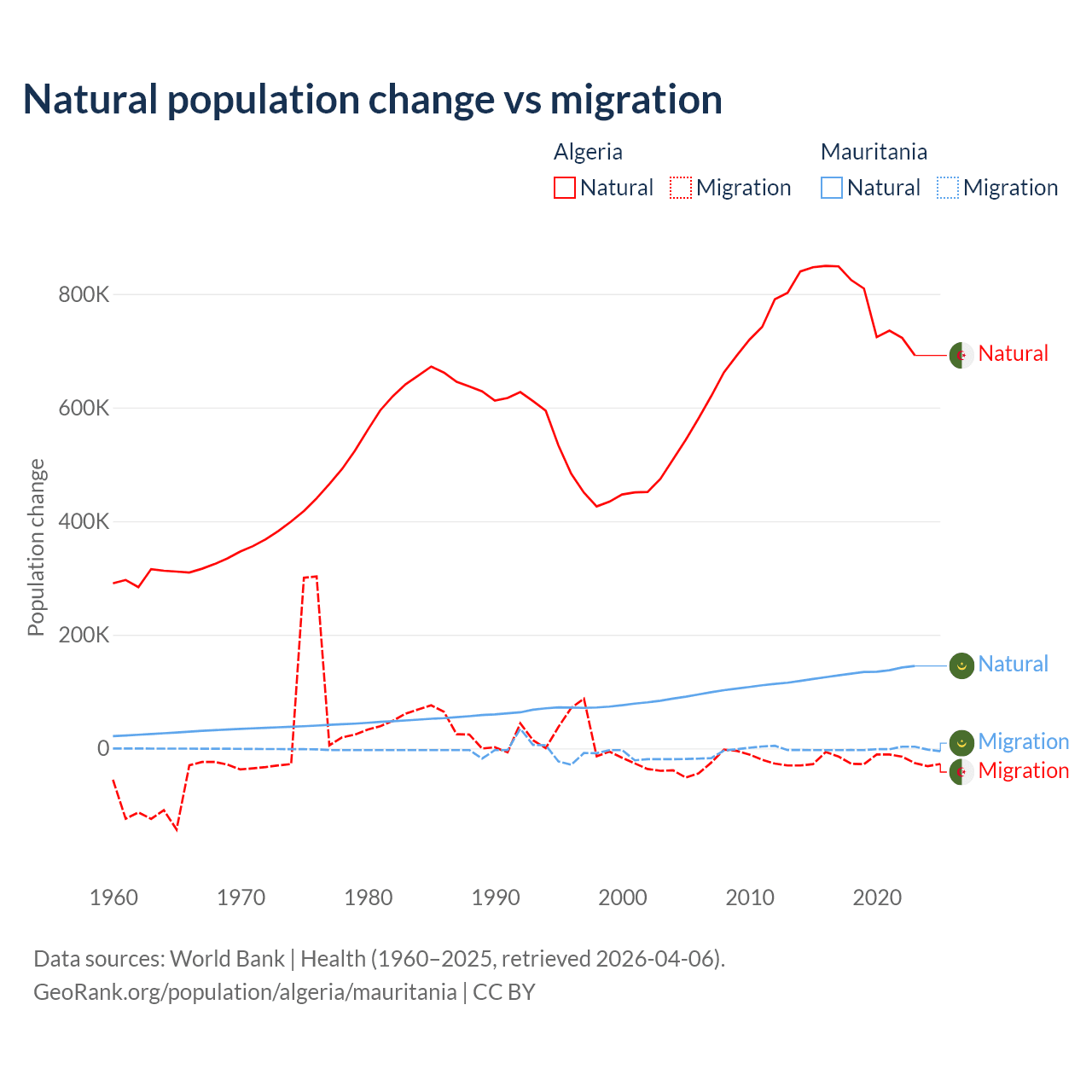 Over the last 10 years, 97.6% of the population change in Algeria is from natural causes (a gain of 7,892,580 people) and 2.42% is from migration (a loss of 195,723 people). In Mauritania 98.9% is from natural causes (a gain of 1,320,903 people) and 1.12% is from migration (a loss of 14,982 people).