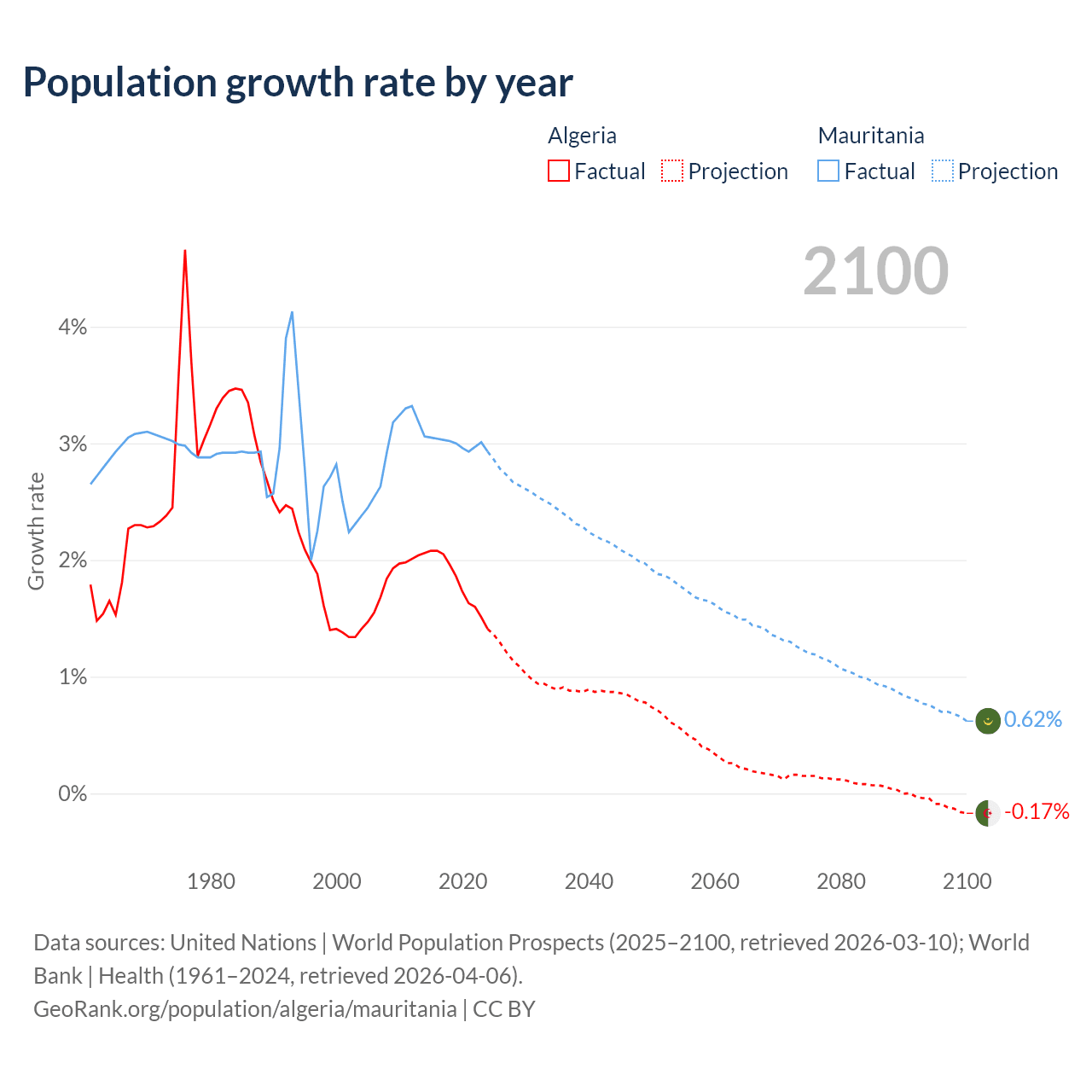 - For the last 10 years, Algeria has had an average growth rate of +1.81% per year vs +3% in Mauritania.