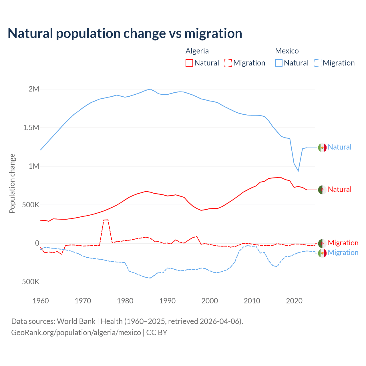 Over the last 10 years, 97.6% of the population change in Algeria is from natural causes (a gain of 7,892,580 people) and 2.42% is from migration (a loss of 195,723 people). In Mexico 87.5% is from natural causes (a gain of 13,080,136 people) and 12.5% is from migration (a loss of 1,876,544 people).