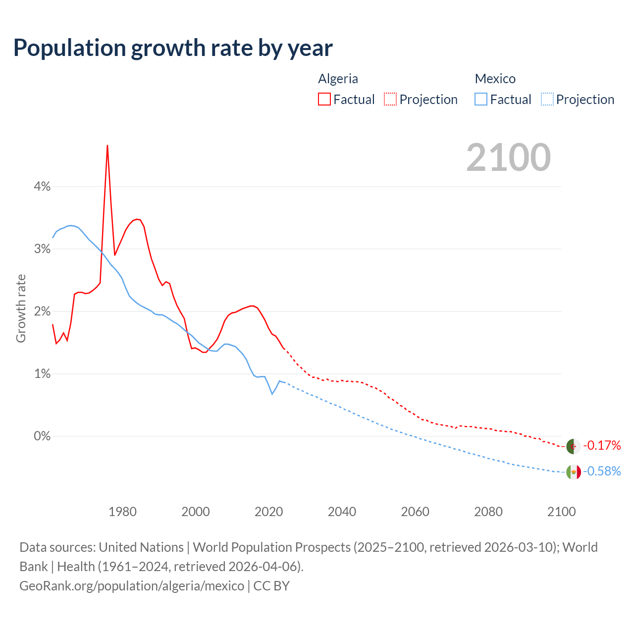 - For the last 10 years, Algeria has had an average growth rate of +1.81% per year vs +0.92% in Mexico.